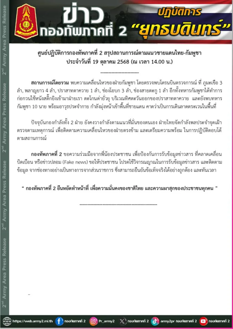 19 ต.ค.2568 ศูนย์ปฏิบัติการกองทัพภาคที่ 2 สรุปภาพรวมสถานการณ์ตามแนวชายแดนไทย-กัมพูชา ว่าพบความเคลื่อนไหวของฝ่ายกัมพูชา โดยตรวจพบโดรนบินตรวจการณ์ ที่ภูมะเขือ 3 ลำ, พลาญยาว 4 ลำ, ปราสาทตาควาย 1 ลำ, ช่องโอบก 3 ลำ, ช่องสายตะกู 1 ลำ อีกทั้งทหารกัมพูชาได้ทำการก่อกวนใช้หนังสติ๊กยิงเข้ามาฝ่ายเรา ตะโกนด่ายั่วยุ บริเวณทิศตะวันออกของปราสาทตาควาย และยังพบทหารกัมพูชา 10 นาย พร้อมอาวุธประจำกาย กำลังมุ่งหน้าเข้าพื้นที่ชายแดน คาดว่าเป็นการเดินลาดตระเวนในพื้นที่