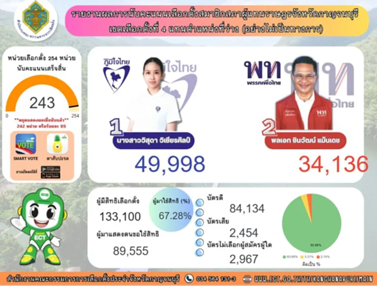 น้ำเงินชนะลอยลำ ผลเลือกตั้งซ่อมกาญจนบุรี เขต 4 “วิสุดา” ภูมิใจไทย คะแนนทิ้งห่าง “ชินวัฒน์” เพื่อไทยกว่า 15,000 คะแนน
