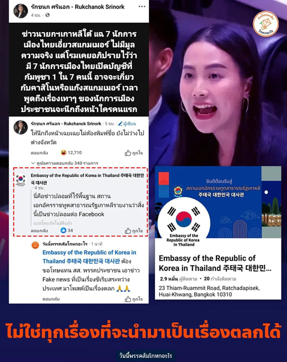 “สถานทูตเกาหลีใต้” สวนปาก “ไอซ์ รักชนก” ปั่นซ้ำข่าว 7 นักการเมืองไทย โยงสแกมเมอร์ ย้ำนี่คือ Fake news