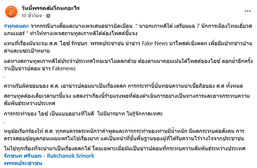 เมื่อวันที่ 20 ตุลาคม 2568 เพจวันนี้พรรคส้มโกหกอะไร ได้โพสต์ข้อความผ่านเฟซบุ๊ก โดยระบุว่า ..#ทุกคนคะ จากกรณีบางสื่อและบางเพจเสนอข่าวบิดเบือน ” นายกเกาหลีใต้ เตรียมแฉ 7 นักการเมืองไทยเอี่ยวสแกมเมอร์ ” ทำให้ทางเพจสถานทูตเกาหลีใต้ต้องโพสต์ชี้แจง