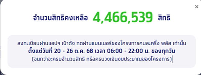 เมื่อวันที่ 20 ตุลาคม 2568 เวลา 06.00 น. ผู้สื่อข่าวรายงานการเปิดให้ประชาชนลงทะเบียนคนละครึ่งพลัสผ่านแอปฯ เป๋าตังเป็นวันแรกตั้งแต่เวลา 06.00-22.00 น. เพื่อรับเงินในโครงการ 2,000-2,400 บาท จำนวนกว่า 20 ล้านสิทธิ ภายใต้งบประมาณ 4.4 หมื่นล้านบาทพบว่าตั้งแต่เวลา 06.00 น. ประชาชนยังไม่สามารถลงทะเบียนได้ เนื่องจากระบบการลงทะเบียนล่ม ซึ่งคาดว่าเกิดจากการที่ประชาชนแห่ลงทะเบียนกันเป็นจำนวนมาก โดยลักษณะของการลงทะเบียนที่ไม่สามารถทำได้จะมี 2 รูปแบบ เช่น ประชาชนไม่สามารถเข้าแอปฯ เป๋าตังได้เลยตั้งแต่เริ่มต้น หรือประชาชนสามารถ เข้าแอปฯ เป๋าตังได้แต่ใส่รหัสไม่สำเร็จ