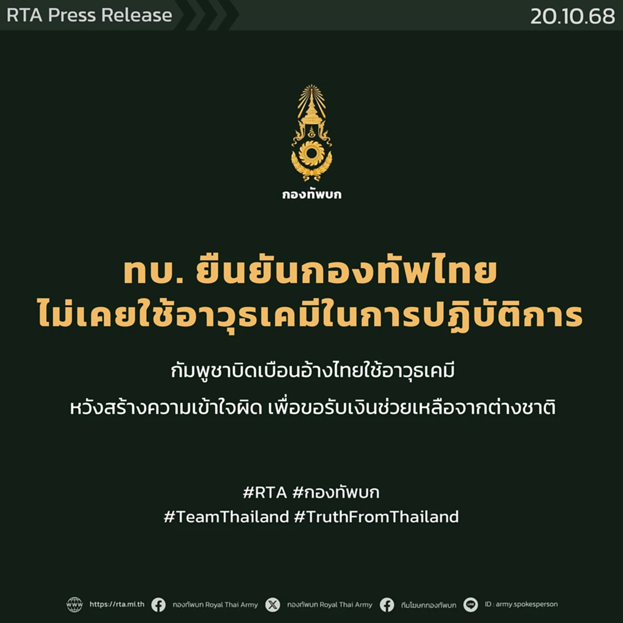 กองทัพบก เน้นย้ำว่าการปฏิบัติการทางทหารของประเทศไทย ไม่มีการใช้อาวุธเคมี ส่วนการใช้กระสุนฟอสฟอรัสขาว WP อยู่ภายใต้กรอบกฎหมายสากลอย่างเคร่งครัด สอดคล้องกับหลักมนุษยธรรมระหว่างประเทศ โดยจะเห็นได้ว่าการที่กัมพูชาเผยแพร่ข้อกล่าวหา มีความมุ่งหวังเพื่อบิดเบือนข้อเท็จจริง สร้างความเข้าใจผิดในเวทีสาธารณะเท่านั้น