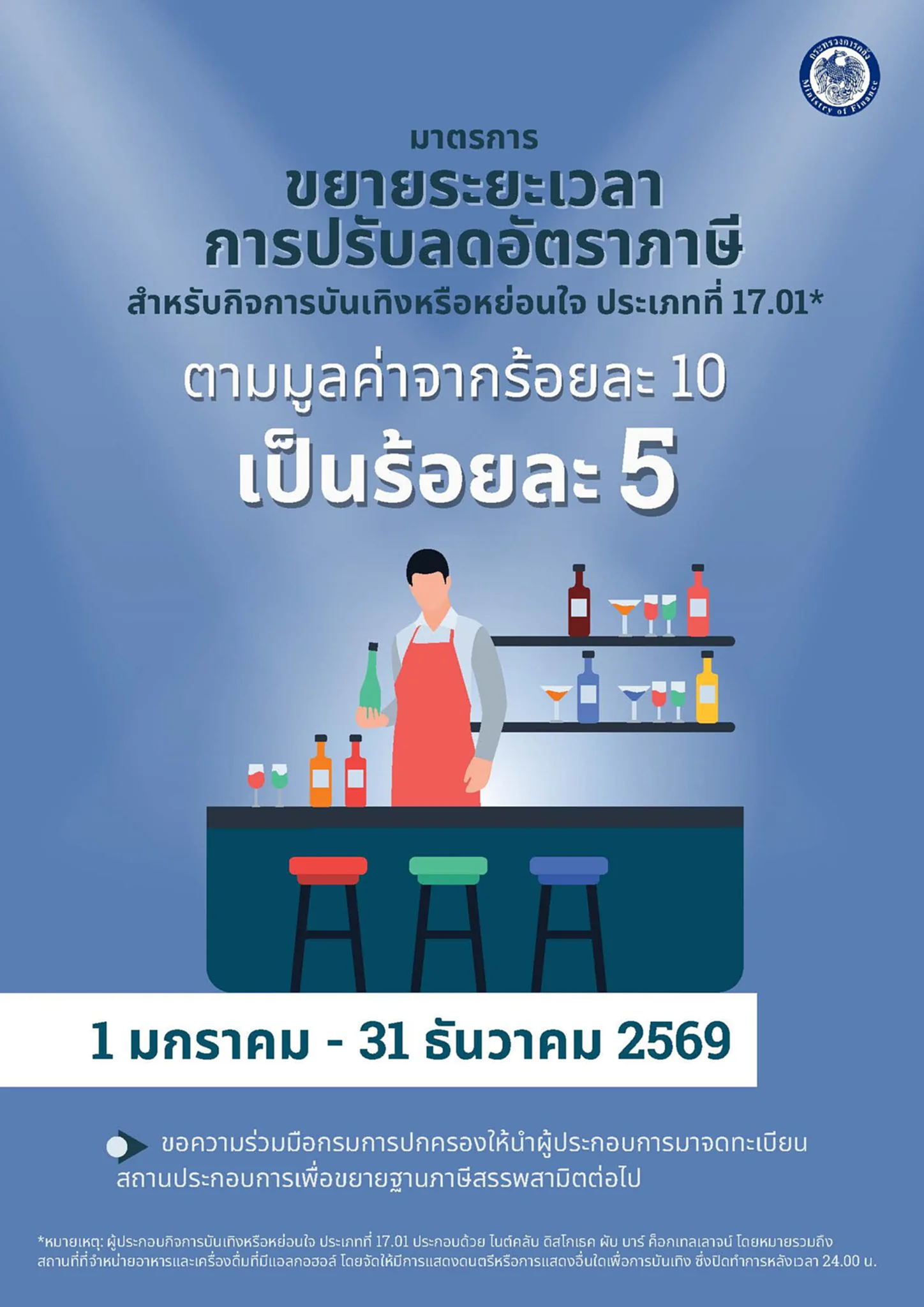 5. ขยายเวลาปรับลดอัตราภาษีตามมูลค่าสำหรับกิจการบันเทิงหรือหย่อนใจ จาก 10% เป็น 5% ออกไปอีก 1 ปี ตั้งแต่วันที่ 1 มกราคม – 31 ธันวาคม 2569 สำหรับกิจการบันเทิงหรือหย่อนใจ อาทิ ไนต์คลับ ดิสโกเธค ผับ บาร์ ค็อกเทลเลาจน์ เป็นต้น.