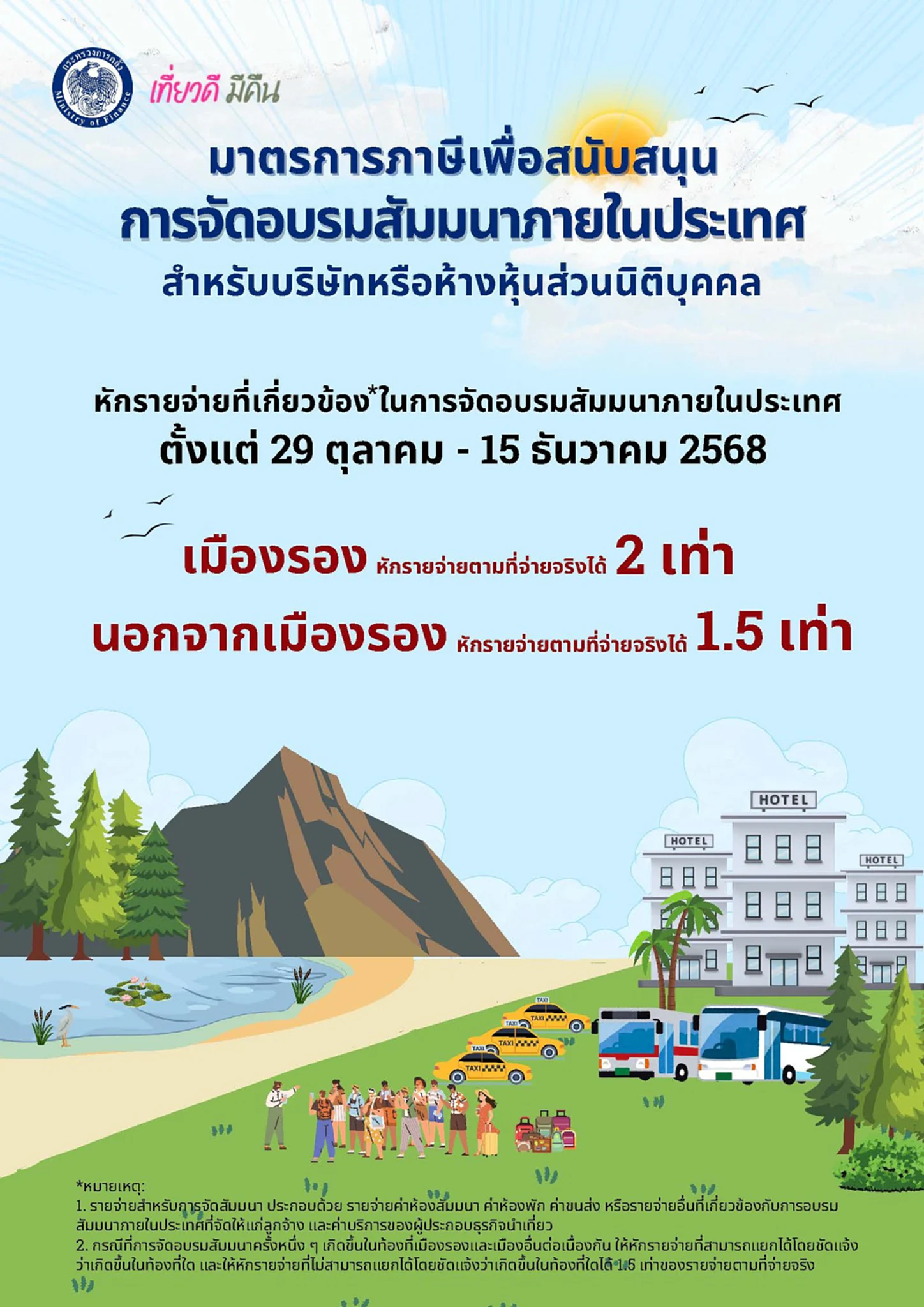 2. มาตรการภาษีเพื่อสนับสนุนนิติบุคคลการจัดอบรมสัมมนาภายในประเทศ ให้บริษัทหรือห้างหุ้นส่วนนิติบุคคลที่ได้จ่ายค่าห้องสัมมนา ค่าห้องพัก ค่าขนส่ง หรือรายจ่ายอื่น ตั้งแต่วันที่ 29 ตุลาคม – 15 ธันวาคม 2568 โดยจ่ายให้แก่ผู้ประกอบการจดทะเบียนภาษีมูลค่าเพิ่มและได้รับใบกำกับภาษีแบบเต็มรูปที่อยู่ในรูปแบบอิเล็กทรอนิกส์ (e-Tax Invoice) เว้นแต่ค่าขนส่งจะจ่ายให้แก่ผู้ประกอบการจดทะเบียนภาษีมูลค่าเพิ่ม แต่ต้องได้ใบรับที่อยู่ในรูปแบบอิเล็กทรอนิกส์ (e-Receipt) สามารถหักรายจ่ายได้ 2 เท่าของรายจ่ายตามที่จ่ายจริงในจังหวัดท่องเที่ยวเมืองรอง และ 1.5 เท่าในเมืองหลัก