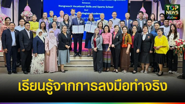 วันที่ 21 ตุลาคม 2568 เวลา 14.00 น. ที่โรงเรียนนงนุชพัฒนาทักษะอาชีพและกีฬา จังหวัดชลบุรี ได้มีพิธีลงนามบันทึกข้อตกลงความร่วมมือทางการศึกษา (MOU) ระหว่าง โรงเรียนนงนุชพัฒนาทักษะอาชีพและกีฬา โดย นายกัมพล ตันสัจจา ประธานสวนนงนุชพัทยา และ Veritas Collegiate Academy นำโดย Ms. Oliva Zhang รองอธิการบดีบริหาร ผู้อำนวยการฝ่ายปฏิบัติการธุรกิจระหว่างประเทศ เพื่อร่วมกันพัฒนาหลักสูตรและแลกเปลี่ยนองค์ความรู้ในระยะเวลา 5 ปี ท่ามกลางแขกผู้มีเกียรติร่วมเป็นสักขีพยาน อย่างคับคั่ง