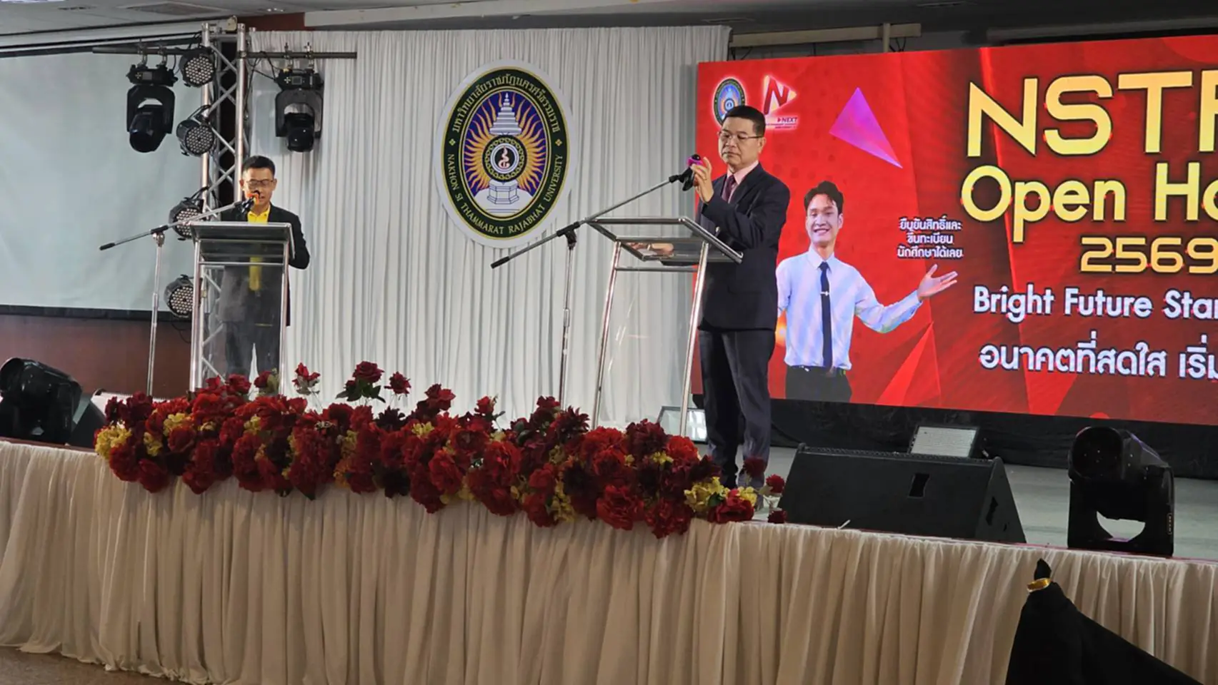 วันที่ 21 ต.ค. 2568 ณ ห้องภักดีดำรงฤทธิ์ มหาวิทยาลัยราชภัฏนครศรีธรรมราช ดร.สมปอง รักษาธรรม รักษาราชการแทนอธิการบดีมหาวิทยาลัยราชภัฏนครศรีธรรมราช เป็นประธานในพิธีเปิดงาน NSTRU Open House 2026 ครั้งที่ 2 ซึ่งจัดขึ้นภายใต้แนวคิด “สัปดาห์เพื่อการพัฒนาท้องถิ่น” เพื่อประชาสัมพันธ์ศักยภาพของมหาวิทยาลัย โดยเฉพาะหลักสูตรและคณะที่เปิดสอนให้นักเรียนในพื้นที่ได้เลือกศึกษาต่อในระดับอุดมศึกษา