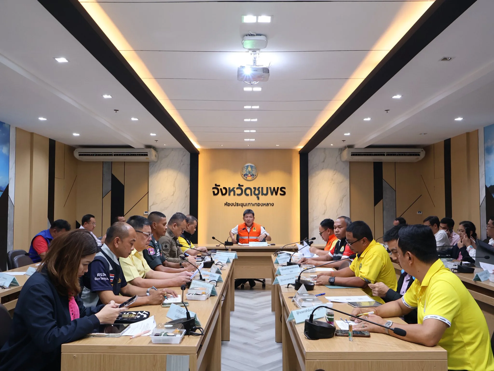 วันที่ 21 ต.ค. 2568 นายเธียรชัย ชูกิตติวิบูลย์ ผู้ว่าราชการจังหวัดชุมพร เป็นประธานการประชุมกองอำนวยการป้องกันและบรรเทาสาธารณภัยจังหวัดชุมพร เพื่อเตรียมความพร้อมรับสถานการณ์อุทกภัยในพื้นที่จังหวัดชุมพร ปี 2568 ติดตามการคาดหมายลักษณะอากาศ ปริมาณน้ำฝนในพื้นที่ และความพร้อมของของหน่วยงานต่าง ๆ โดยมีหน่วยงานที่เกี่ยวข้อง เข้าร่วมประชุมฯ ณ ห้องประชุมเกาะทองหลาง ศาลากลางจังหวัดชุมพร ชั้น 3