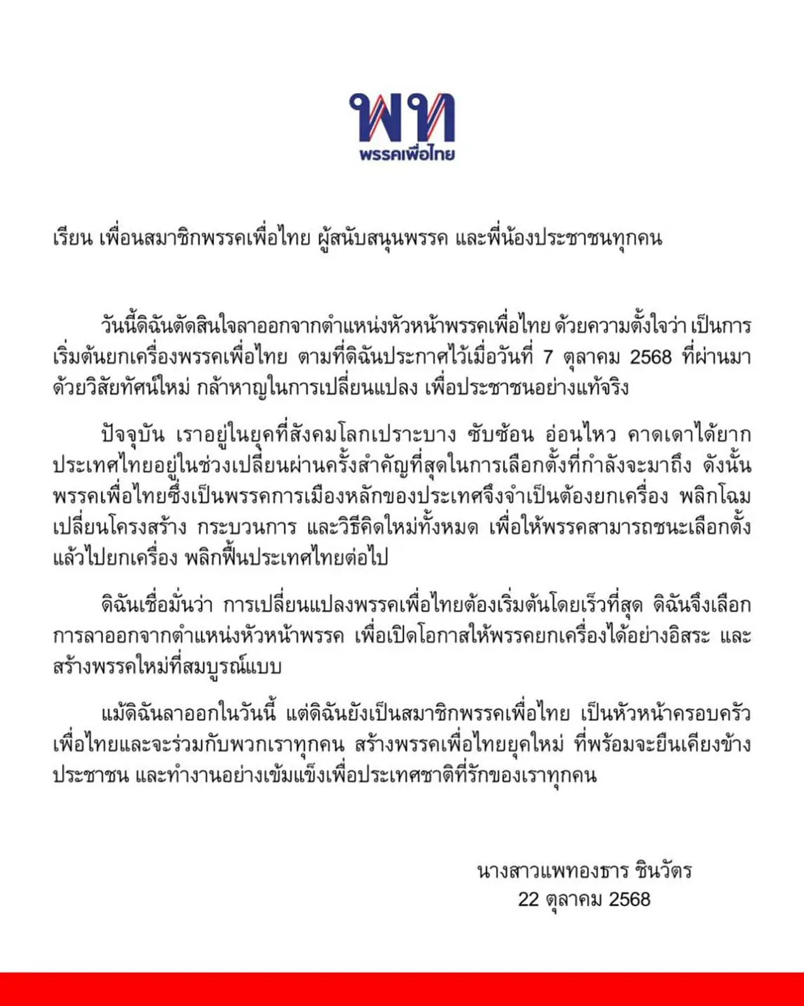 วันนี้ดิฉันตัดสินใจลาออกจากตำแหน่งหัวหน้าพรรคเพื่อไทย ด้วยความตั้งใจว่าเป็นการเริ่มต้นยกเครื่องพรรคเพื่อไทย ตามที่ดิฉันประกาศไว้เมื่อวันที่ 7 ตุลาคม 2568 ที่ผ่านมา ด้วยวิสัยทัศน์ใหม่ กล้าหาญในการเปลี่ยนแปลง เพื่อประชาชนอย่างแท้จริง