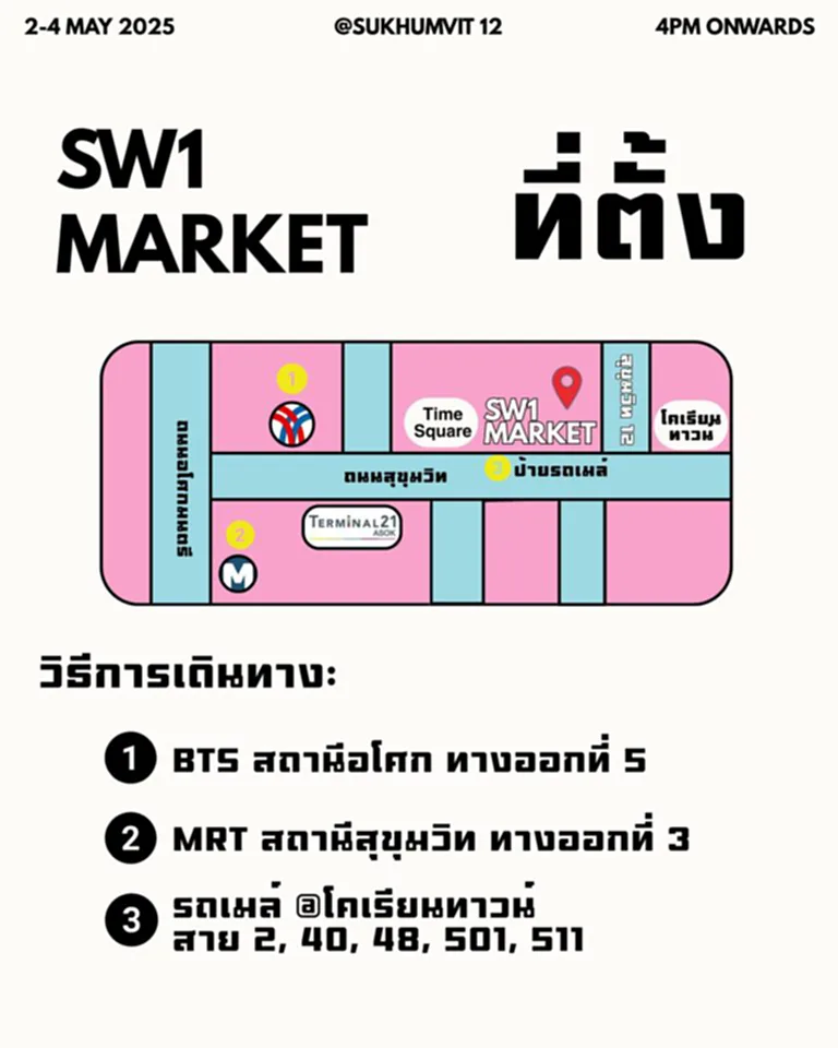 จุดเด่นของ SW1 Market คือทำเลที่ตั้งอยู่ใกล้ระบบขนส่งมวลชนทั้ง BTS และ MRT ทำให้การเดินทางสะดวก ไม่ว่าจะเป็นนักท่องเที่ยวต่างชาติที่พักย่านสุขุมวิท–อโศก หรือชาวออฟฟิศในย่านใจกลางเมือง ก็สามารถแวะมาเดินเล่น ชิมอาหาร และช้อปปิ้งได้ง่ายเพียงไม่กี่นาทีจากสถานีรถไฟฟ้า นอกจากนี้ ยังมีรถโดยสารสาธารณะและแท็กซี่ให้บริการตลอด 24 ชั่วโมง รวมถึงที่จอดรถรองรับภายในพื้นที่ตลาด