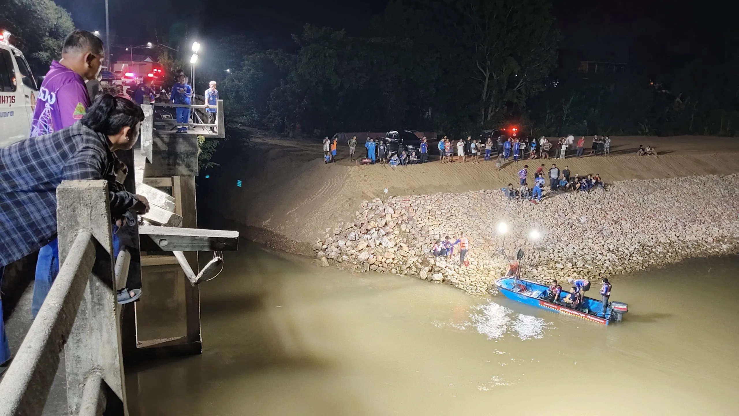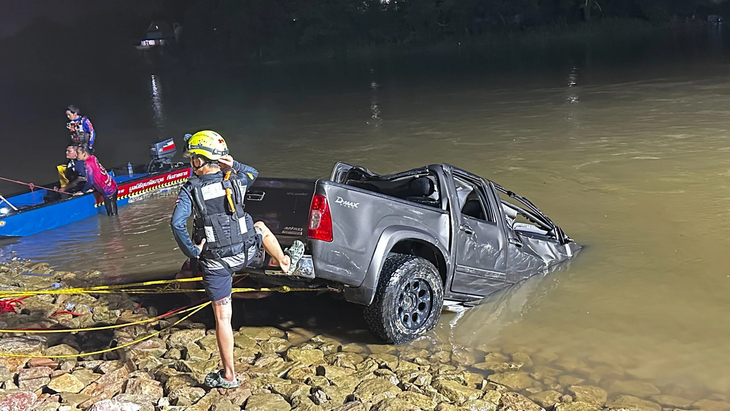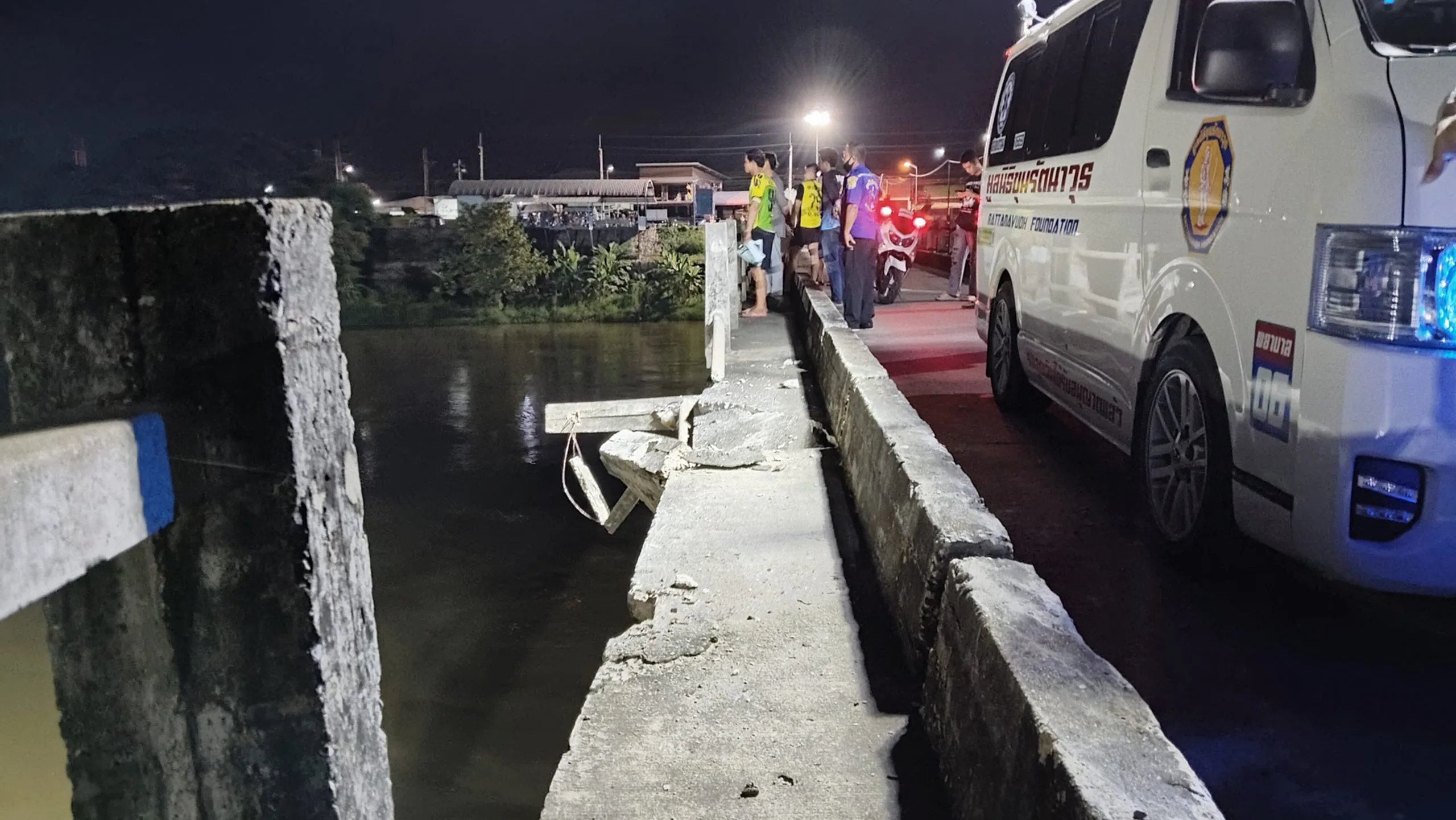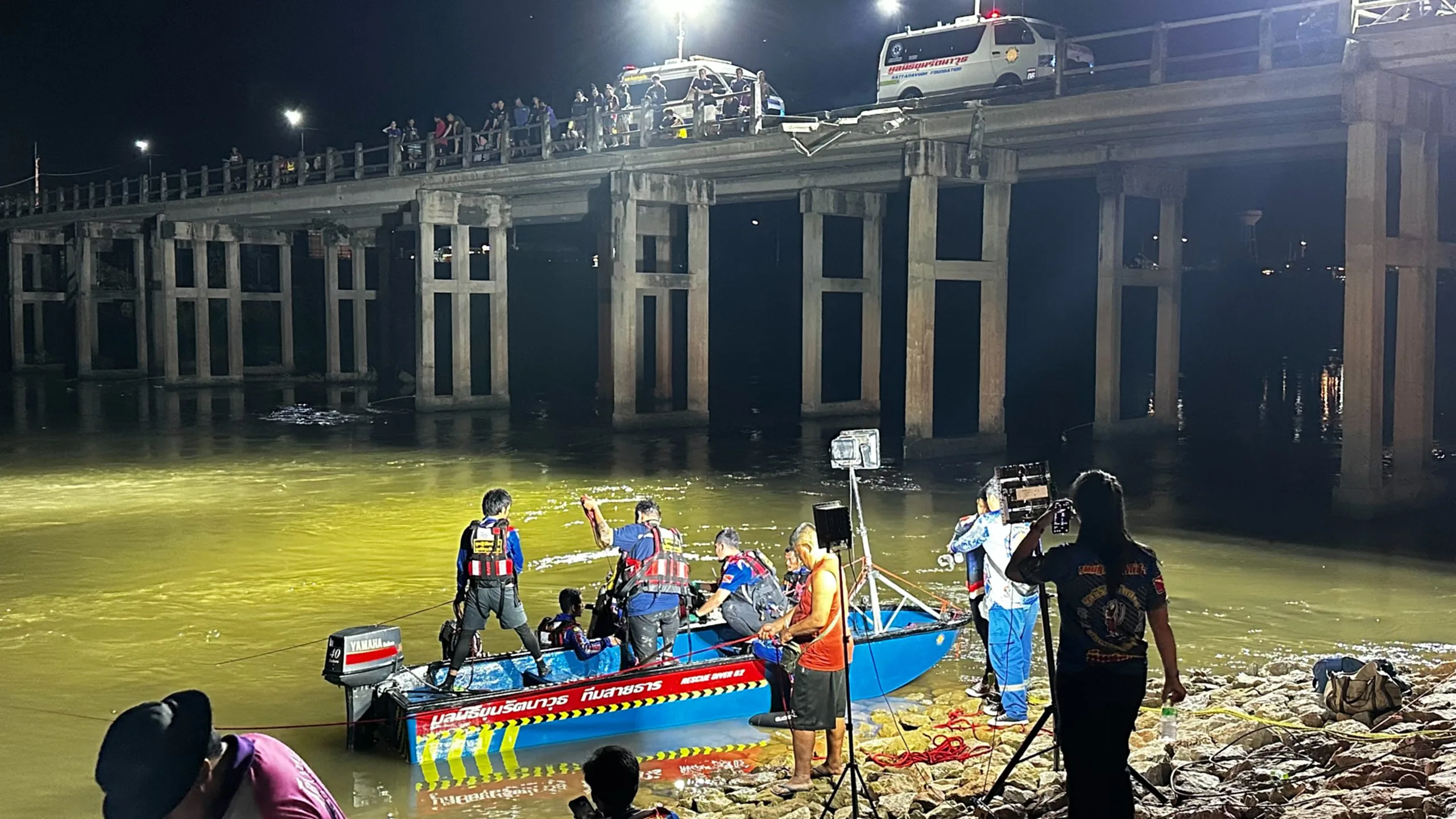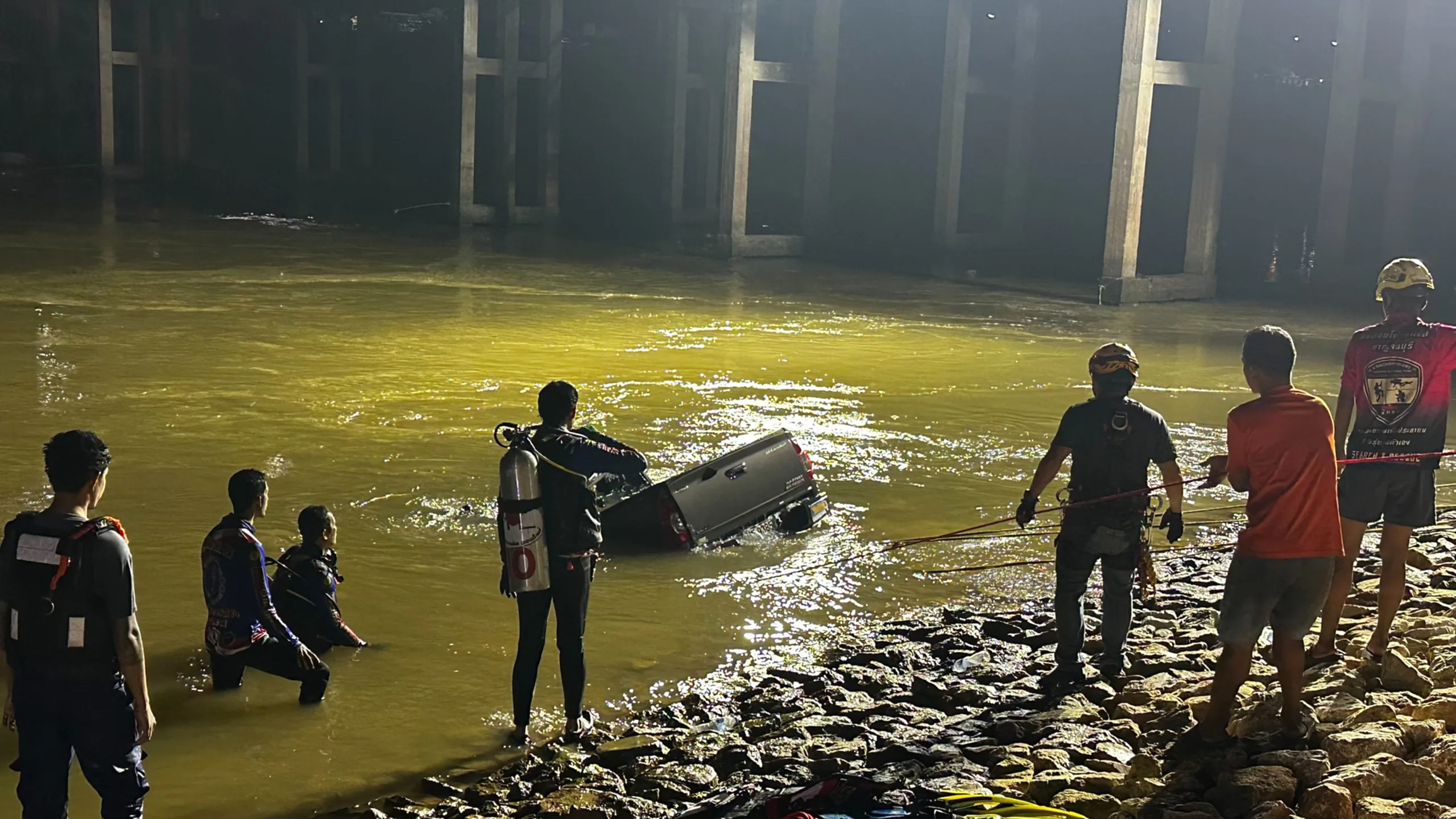 เมื่อเวลา 21.42 น. วันที่ 22 ตุลาคม 2568 รตอ. ธนกาญน์ ทับขำ ร้อยเวร สภ.ลูกแก จังหวัดกาญจนบุรี พร้อมด้วยเจ้าหน้าที่กู้ภัยและชุดประดาน้ำจากมูลนิธิขุนรัตนาวุธ เข้าตรวจสอบเหตุรถกระบะตกสะพานท่าเสา–ลูกแก พื้นที่หมู่ 4 ตำบลดอนขมิ้น อำเภอท่ามะกา หลังได้รับแจ้งว่ามีรถตกลงไปในแม่น้ำด้านล่าง