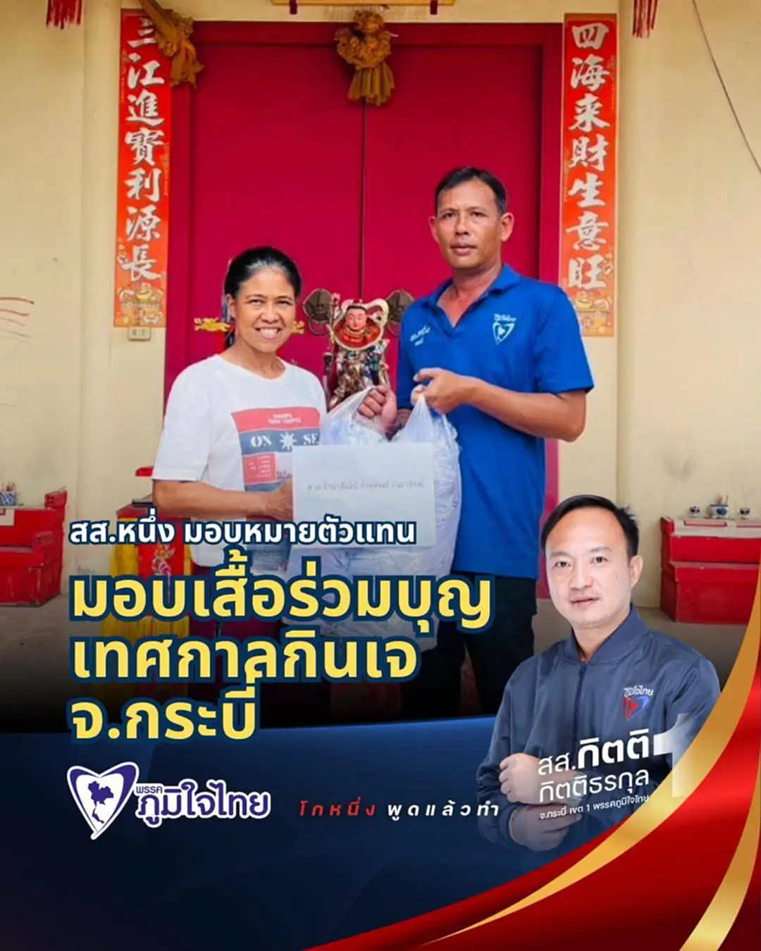 วันที่ 23 ต.ค. 2568 นายกิตติ กิตติธรกุล หรือ “ส.ส.หนึ่ง” สมาชิกสภาผู้แทนราษฎรจังหวัดกระบี่ เขต 1 พรรคภูมิใจไทย ร่วมส่งต่อความดีงามในเทศกาลกินเจ ด้วยการมอบ “เสื้อร่วมบุญเทศกาลกินเจ” ให้แก่ประชาชนและผู้ร่วมกิจกรรมในพื้นที่ เพื่อเชิญชวนทุกคนร่วมถือศีล ทำความดี และสร้างแรงบันดาลใจในการใช้ชีวิตอย่างมีเมตตา