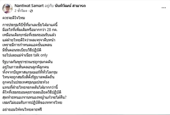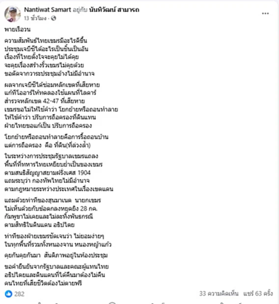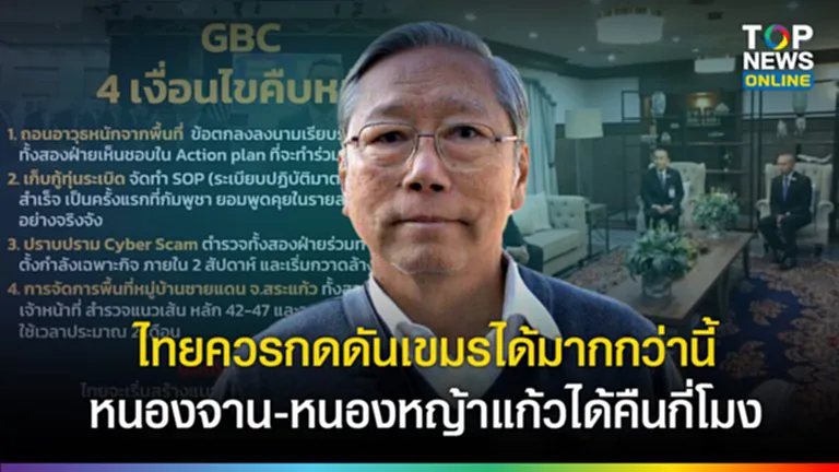 จากกรณี วันที่ 23 ตุลาคม 2568 พลเอกณัฐพล นาคพาณิชย์ รัฐมนตรีว่าการกระทรวงกลาโหม นำคณะผู้แทนไทย เข้าร่วมการประชุมคณะกรรมการชายแดนทั่วไป ไทย–กัมพูชา หรือ GBC สมัยพิเศษ ครั้งที่ 2/2568 ที่กรุงกัวลาลัมเปอร์ ประเทศมาเลเซีย โดยได้เปิดเผยก่อนขึ้นเครื่องว่า ตอนนี้คืบหน้าไปแล้วกว่า 90% ที่ทราบจากฝ่ายเลขานุการ พร้อมย้ำว่าไม่มีเรื่องใดที่น่ากังวลใจ ซึ่งจะเดินทางไปคุยต่อให้แล้วเสร็จ