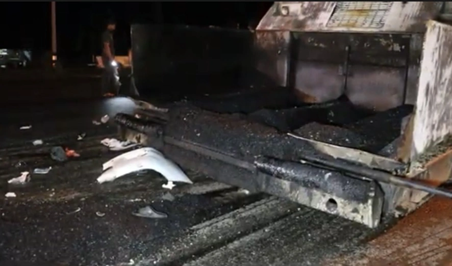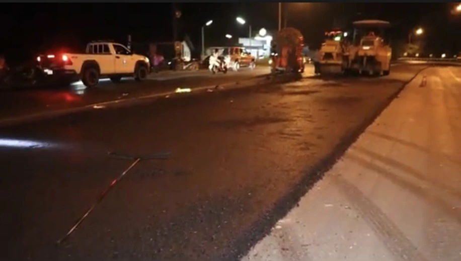 ใกล้กันพบรถยนต์กระบะคู่กรณีจอดอยู่กลางถนน ยี่ห้อโตโยต้า ตอนเดียวสีขาว ด้านหลังกระบะติดกรงรั้วเหล็กบรรทุกผลมะพร้าวมาเต็มคัน สภาพรถด้านขวาพังทั้งแถบ ส่วนคนขับอยู่ในที่เกิดเหตุทราบชื่อคือนายกิตติพงศ์ ชาวตำบลตะโก อ.ทุ่งตะโก จ.ชุมพร ทราบว่า บรรทุกมะพร้าวมาจากปากน้ำชุมพร มุ่งหน้าปลายทางทับสะแก จ.ประจวบคีรีขันธ์ ขับมาปกติความเร็ว 70-80 กม./ชม. อ้างว่าอยู่ๆเห็นมีคนหน้ารถ เหมือนผีหลอกเลย บอกเบรกไม่ทัน ซึ่งก็ไม่เห็นมีไฟเตือน ถ้ามีไฟเตือนก็ต้องชะลอแล้วด้านนายอี๊ด หัวหน้าพนักงานทำถนนปูยางมะตอย บริษัทผู้รับเหมา เล่าว่า ทำถนนสายดังกล่าวมาประมาณ 3 สัปดาห์แล้ว วันนี้เร่งทำทั้งวัน ขณะเกิดเหตุมีพนักงานทำถนน 10 คน จู่ๆก็เกิดอุบัติเหตุรับว่าติดตั้งไฟสัญญาญเตือนปิดหัวท้ายจุดที่มีการก่อสร้าง และวางกรวยตลอดแนว ตนรับอีกว่าถ้าไม่ติดตั้งไฟเตือนจะไม่ให้ลูกน้องทำงานเพราะอันตราย ทางด้านพนักงานสอบสวน ตรวจสอบในที่เกิดเหตุพร้อมเก็บภาพบันทึกไว้เป็นหลักฐาน เบื้องต้นแจ้งข้อกล่าวหานายกิตติพงศ์ คนขับกระบะว่า ขับรถโดยประมาททำให้ผู้อื่นได้รับบาดเจ็บ พร้อมทั้งนำตัวไปสภ.เมืองชุมพร ตรวจหาวัดปริมาณแอลกอฮอล์ในร่างกายด้วยว่ามีหรือไม่ เพื่อดำเนินคดีตามขั้นตอนของกฎหมายต่อไป.