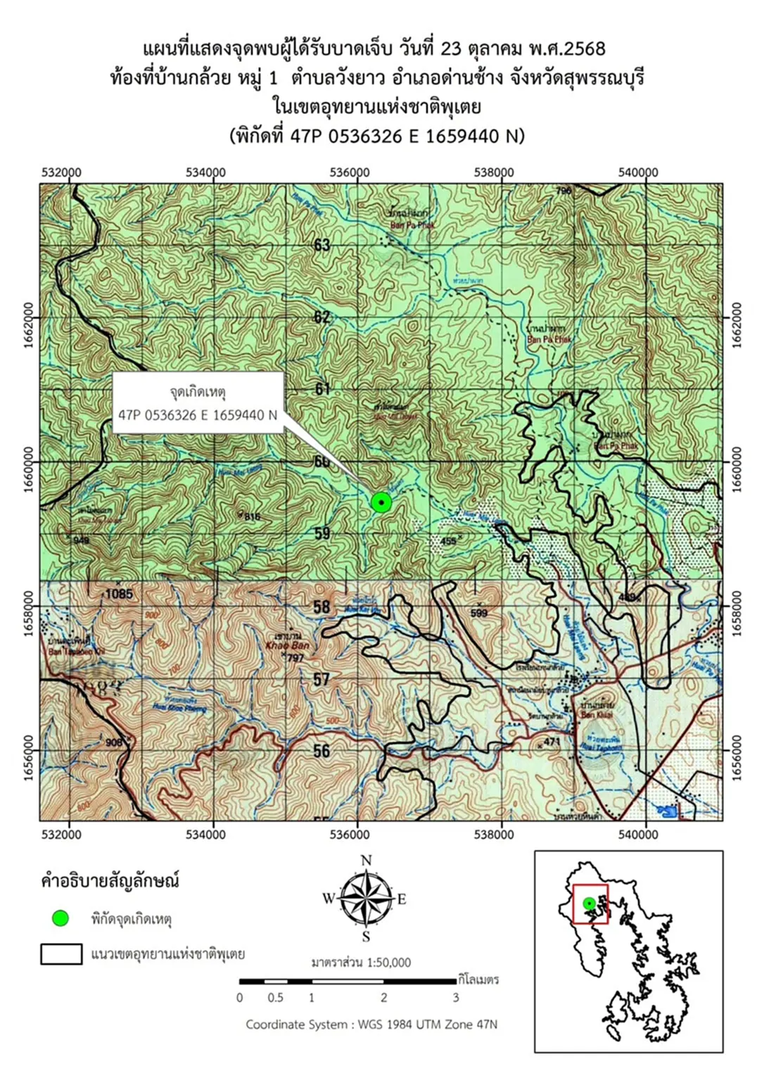 โดยเมื่อเวลาประมาณ 16.00 น. เจ้าหน้าที่อุทยานแห่งชาติพุเตยกำลังเดินทางเพื่อไปลาดตระเวนเชิงคุณภาพ ระหว่างเดินทางผ่านหมู่บ้าน ได้รับแจ้งจากชาวบ้านว่ามีชาวบ้านโดนกระทิงทำร้ายจนได้รับบาดเจ็บ หัวหน้าอุทยานแห่งชาติพุเตยจึงได้สั่งการให้ชุดกู้ภัยอุทยานแห่งชาติพุเตยและชุดลาดตระเวน 2 ชุด เข้าพื้นที่เพื่อให้การช่วยเหลือ