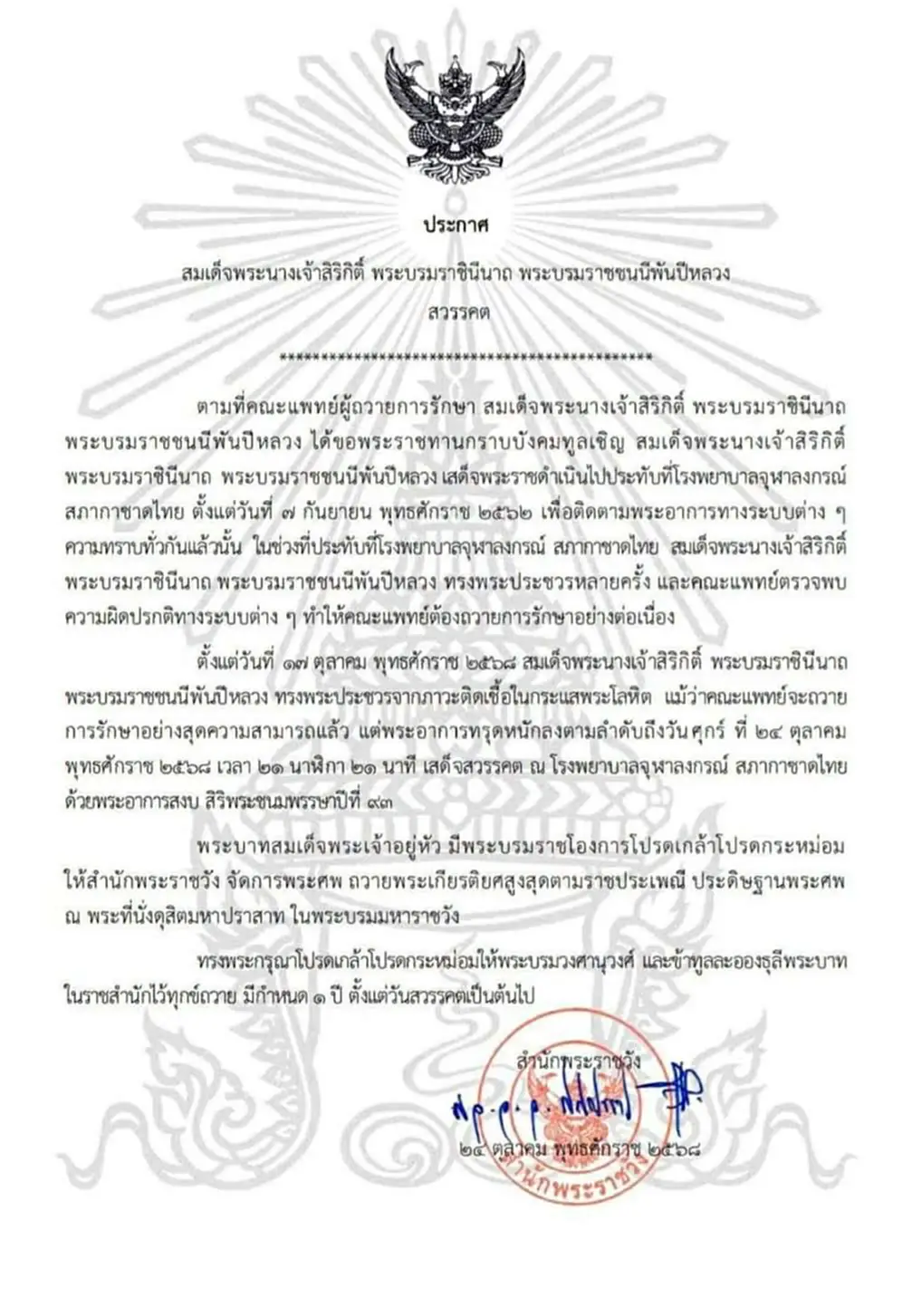 สำนักพระราชวัง เผยแพร่ประกาศ สมเด็จพระนางเจ้าสิริกิติ์ พระบรมราชินีนาถ พระบรมราชชนนีพันปีหลวง สวรรคต