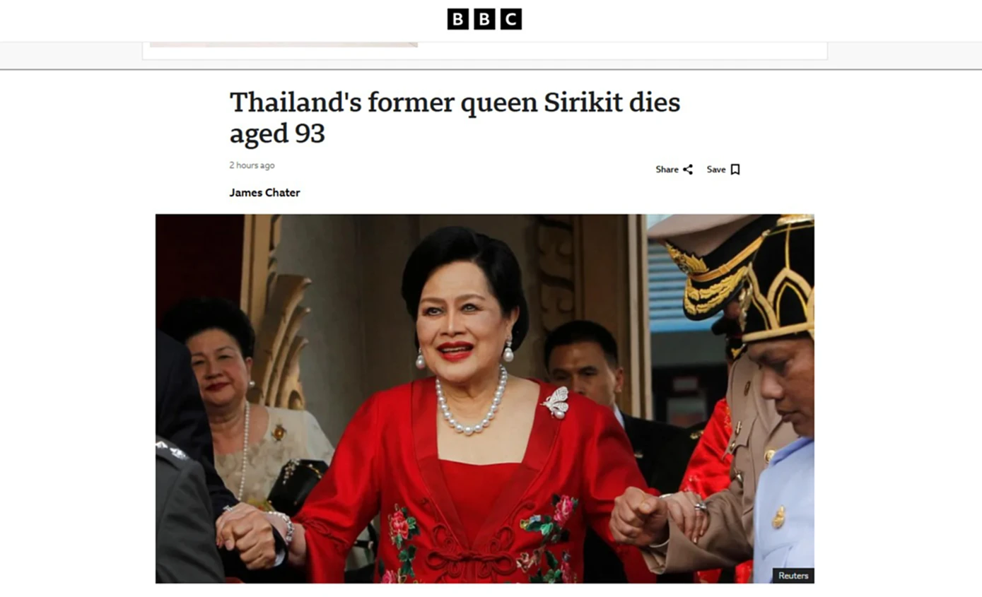 สำนักข่าวต่างประเทศ รายงานการสวรรคตของสมเด็จพระนางเจ้าสิริกิติ์ พระบรมราชินีนาถ พระบรมราชชนนีพันปีหลวง หรือ Queen Sirikit โดยอ้างแถลงการณ์สำนักพระราชวัง พร้อมเกร็ดพระราชประวัติในส่วนที่เป็นจดจำ เมื่อครั้งติดตามรัชกาลที่ 9 เสด็จประพาสต่างประเทศ