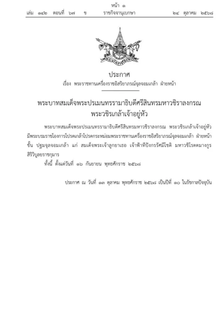 วันที่ 25 ต.ค.2568 ผู้สื่อข่าวรายงานว่า เว็บไซต์ ราชกิจจานุเบกษา เผยแพร่ประกาศ เรื่อง พระราชทานเครื่องราชอิสริยากรณ์จุลจอมเกล้า ฝ่ายหน้า ความว่า