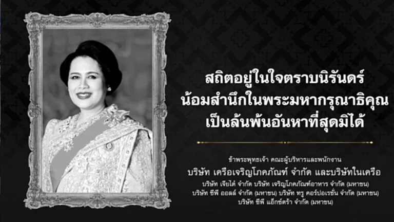 เครือเจริญโภคภัณฑ์และพนักงานทั่วทั้งเครือขอน้อมแสดงความอาลัย และพร้อมน้อมนำพระราชจริยวัตรและพระราชปณิธานอันทรงคุณค่ามาเป็นแนวทางในการทำงานและดำเนินชีวิตเพื่อสืบสาน รักษา และต่อยอดพระราชปณิธานแห่งความดีงาม ถวายเป็นพระราชกุศลแด่สมเด็จพระบรมราชชนนีพันปีหลวง ด้วยความสำนึกในพระมหากรุณาธิคุณเป็นล้นพ้นอันหาที่สุดมิได้