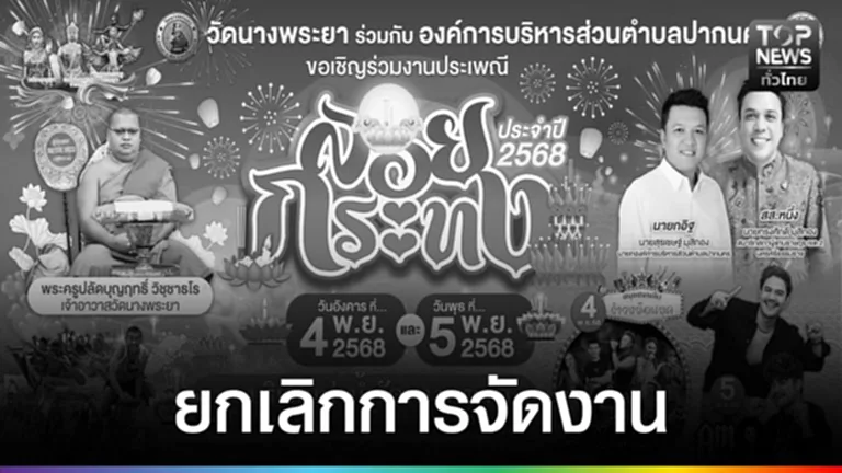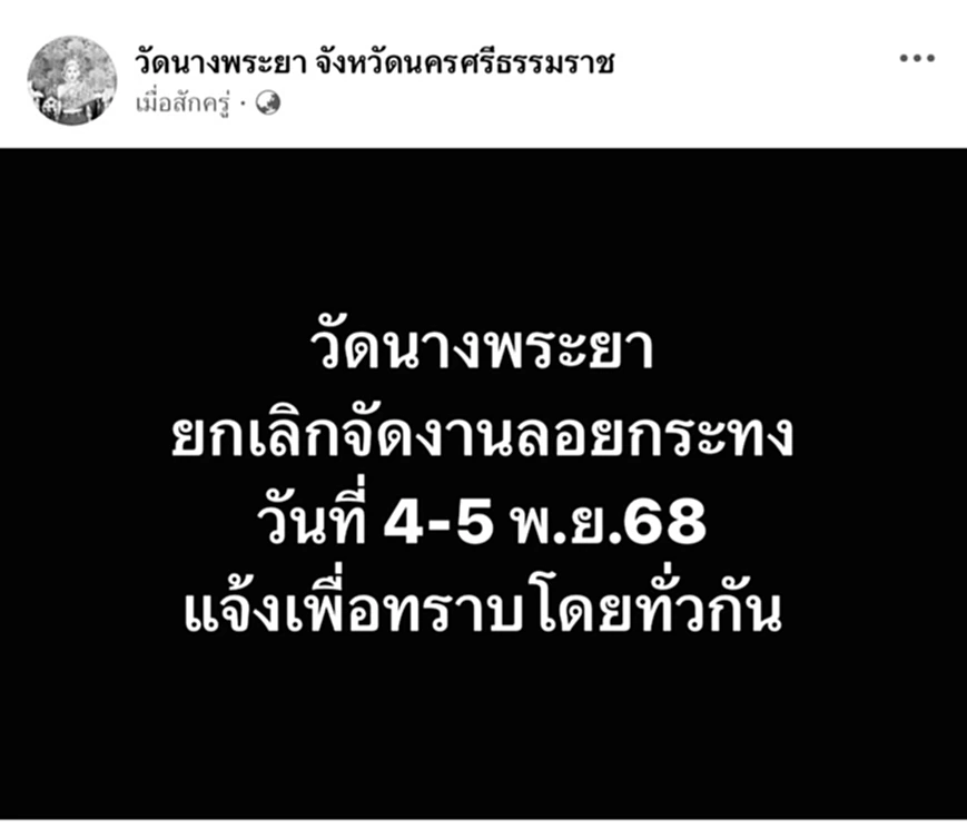 วันที่ 25 ต.ค. 2568 วัดนางพระยา ต.ปากนคร อ.เมือง จ.นครศรีธรรมราช ได้โพสต์ประกาศผ่านเพจทางการของวัด แจ้ง ยกเลิกการจัดงานประเพณีลอยกระทง ประจำปี 2568 ซึ่งเดิมมีกำหนดจัดขึ้นระหว่างวันที่ 4 พ.ย. – 5 พ.ย. 2568 ณ บริเวณท่าน้ำวัดนางพระยา