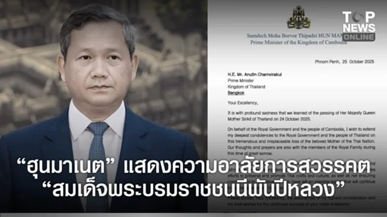 วันที่ 25 ต.ค. 2568 ฮุนมาเนต นายกรัฐมนตรีกัมพูชา ส่งหนังสือแสดงความอาลัย ถึง นายอนุทิน ชาญวีรกูล นายกรัฐมนตรี ต่อการสวรรคต ของ สมเด็จพระนางเจ้าสิริกิติ์ พระบรมราชินีนาถ พระบรมราชชนนีพันปีหลวง ระบุว่า