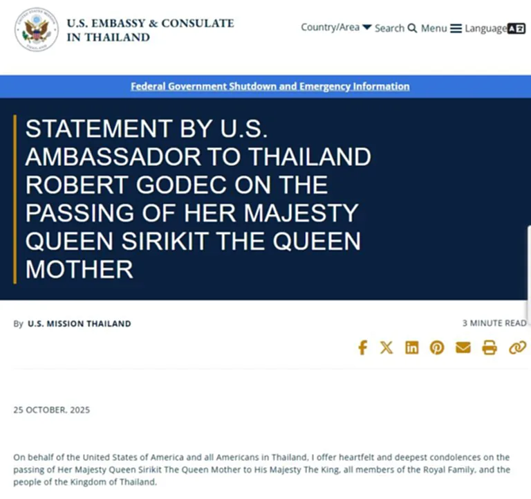เมื่อวานนี้ (เสาร์ที่ 25 ตค) สถานเอกอัครราชทูตสหรัฐประจำประเทศไทยได้เผยแพร่แถลงการณ์ของนายโรเบิร์ต โกเด็ก เอกอัครราชทูตสหรัฐ โดยมีข้อความระบุว่า