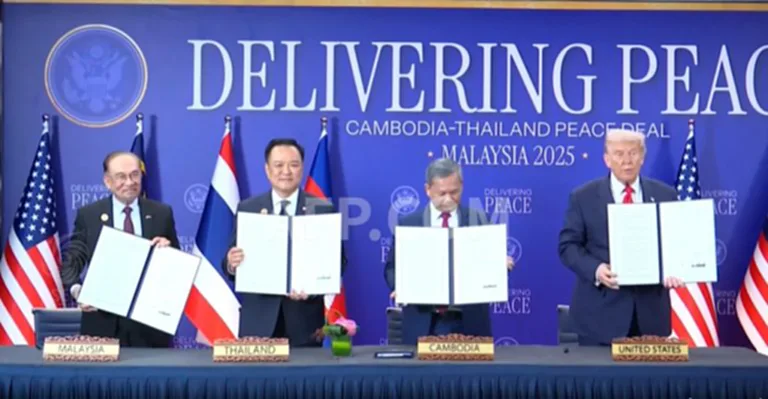 BBC และ AFP รายงานว่าระหว่างร่วมลงนามเป็นสักขีพยานข้อตกลงสันติภาพไทย-กัมพูชาซึ่งลงนามนายอนุทิน ชาญวีรกูล นายกรัฐมนตรีของไทยและฮุน มาเน็ต ผู้นำกัมพูชา เมื่อช่วงเช้าที่ผ่านมา (อาทิตย์ที่ 26 ตค.) ในที่ประชุมสุดยอดผู้นำอาเซียนที่กรุงกัวลาลัมเปอร์ ประเทศมาเลเซีย ทรัมป์กล่าวยกย่องข้อตกลงดังกล่าวว่าเป็น “ช่วงเวลาแห่งประวัติศาสตร์” ซึ่งจะช่วยปกป้องประชาชนหลายล้านชีวิต พร้อมลุกขึ้นกล่าวสุนทรพจน์ขอบคุณนายกรัฐมนตรีของไทยและกัมพูชาในความกล้าหาญ พร้อมย้ำชัดแบบไม่อ้อมค้อมว่าเขาใช้ข้อตกลงทางการค้ามากดดันสองประเทศให้ยุติสงคราม