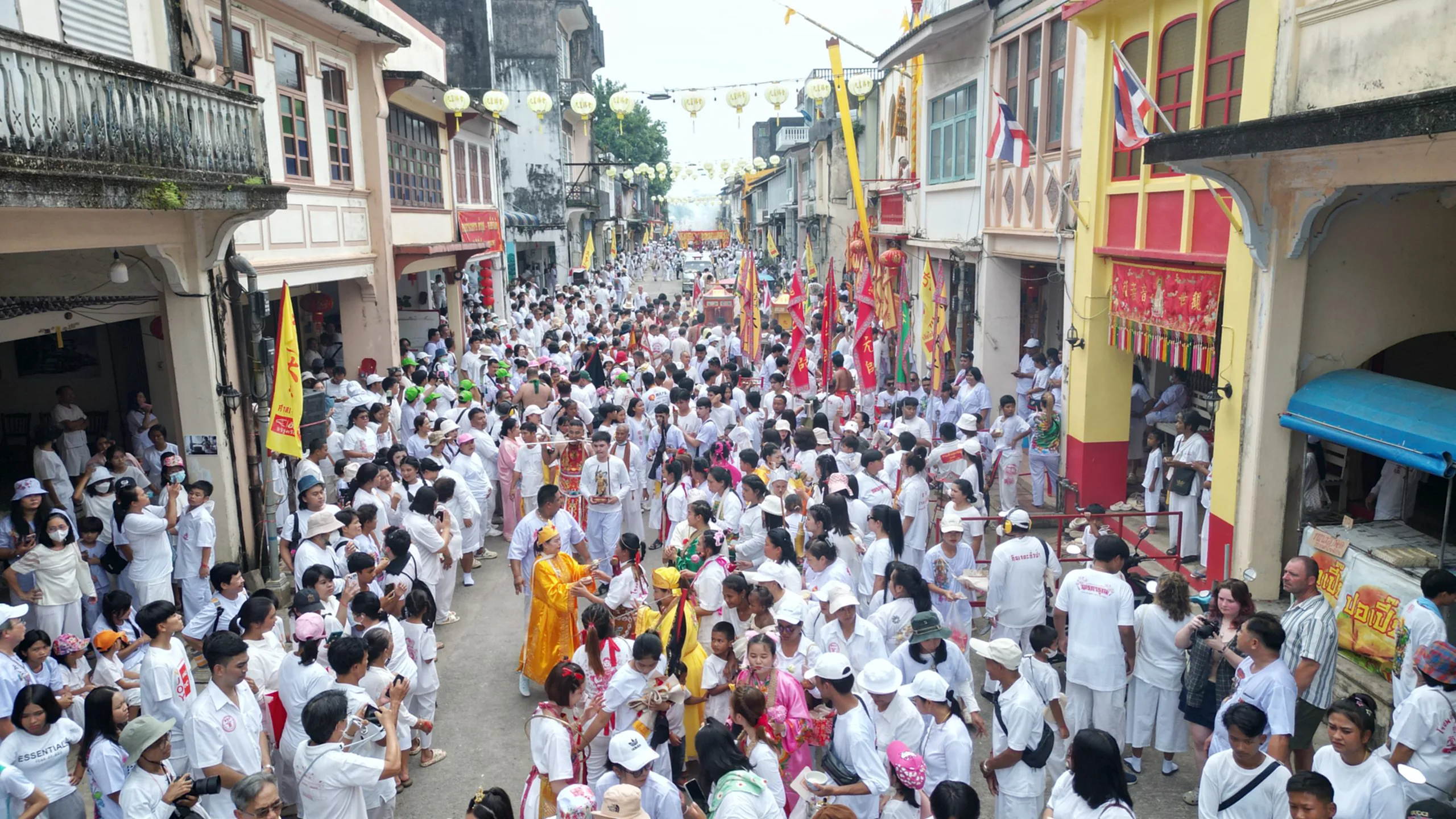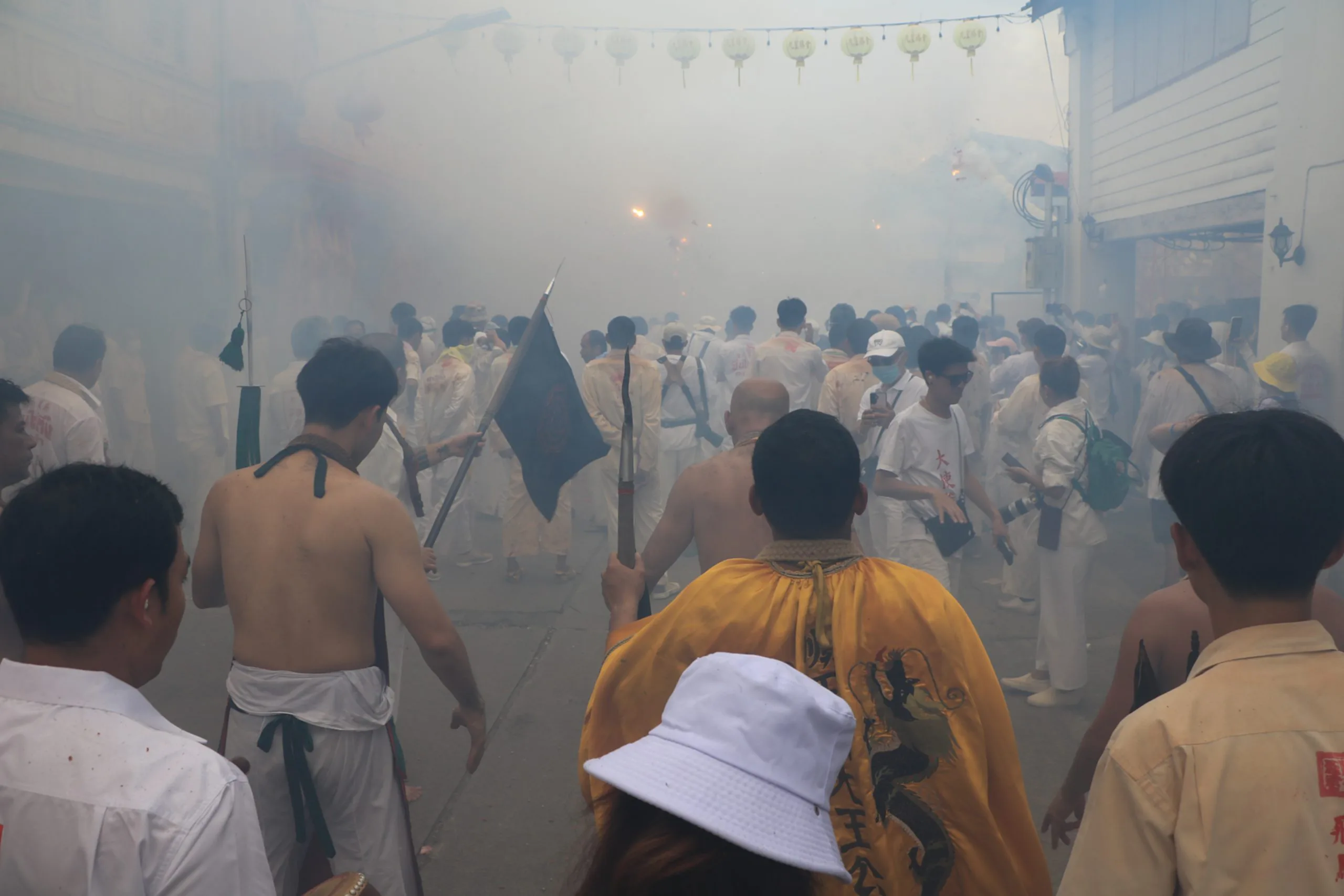ขบวนแห่ยังมีเหล่าม้าทรงทั้งชายและหญิงหลายร้อยคน แสดงอิทธิฤทธิ์ด้วยการทิ่มแทงร่างกายเพื่อรับเคราะห์แทนประชาชน ตามความเชื่อดั้งเดิมของชาวจีนโพ้นทะเล โดยตลอดเส้นทางแห่มีเสียงประทัดดังกึกก้องไปทั่วเมือง ไฮไลต์สำคัญอยู่บริเวณหน้าศาลเจ้าพ่อกวนอูและศาลเจ้ากู่ไช่ตึ๋ง ซึ่งเป็นจุดที่ผู้คนรอชมแน่นขนัด เสียงประทัดดังต่อเนื่องราวกับสมรภูมิสงครามกว่า 2 ชั่วโมง คาดว่าปีนี้มีการจุดประทัดรวมมากกว่า 5 ล้านนัด พื้นถนนที่ขบวนพระผ่านกลายเป็นพรมสีแดงจากเศษประทัด สื่อถึงความเป็นสิริมงคลและโชคลาภตลอดปี