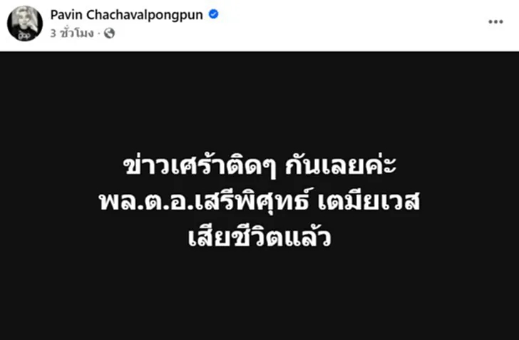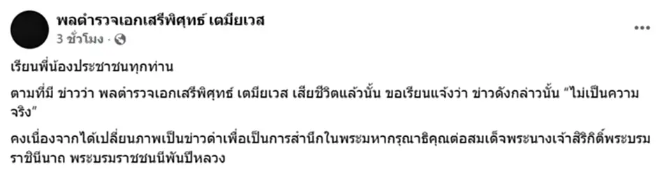 เมื่อวันที่ 27 ตุลาคม 2568 พลตำรวจเอกเสรีพิศุทธ์ เตมียเวส หัวหน้าพรรคเสรีรวมไทย ได้ออกมาโพสต์ข้อความผ่านเฟซบุ๊กว่า เรียนพี่น้องประชาชนทุกท่านตามที่มีข่าวว่าพลตำรวจเอกเสรีพิศุทธ์ เตมียเวส เสียชีวิตแล้วนั้น ขอเรียนแจ้งว่า ข่าวดังกล่าวนั้น “ไม่เป็นความจริง” คงเนื่องจากได้เปลี่ยนภาพเป็นข่าวดำเพื่อเป็นการสำนึกในพระมหากรุณาธิคุณต่อสมเด็จพระนางเจ้าสิริกิติ์พระบรมราชินีนาถ พระบรมราชชนนีพันปีหลวง