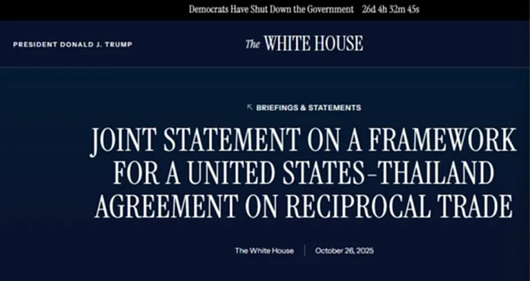 วันที่ 26 ตุลาคม 2568 เว็ปไซต์ทำเนียบขาวสหรัฐเผยแพร่แถลงการณ์ร่วมว่าด้วยกรอบข้อตกลงทางการค้าต่างตอบแทนสหรัฐ-ไทย ซึ่งไทยพร้อมยกเลิกภาษีสินค้าสินค้านำเข้าจากสหรัฐมากถึง 99% ครอบคลุมตั้งแต่สินค้าอุตสาหกรรม อาหาร และเกษตรกรรม, ทุ่มเกือบ 880,000 ล้านบาทซื้อเครื่องบิน น้ำมันดิบ ก๊าซธรรมชาติ อาหารสัตว์จากสหรัฐ