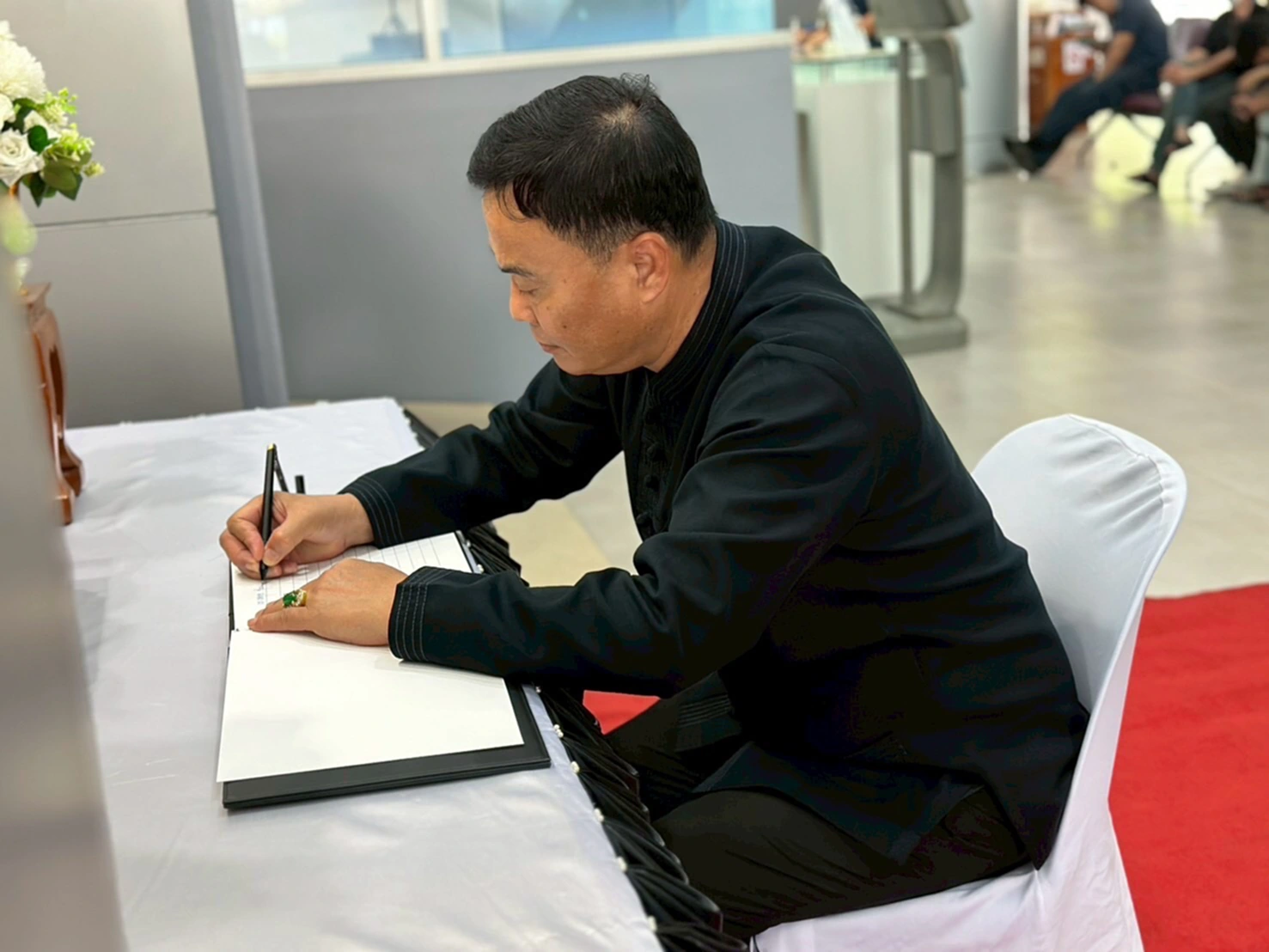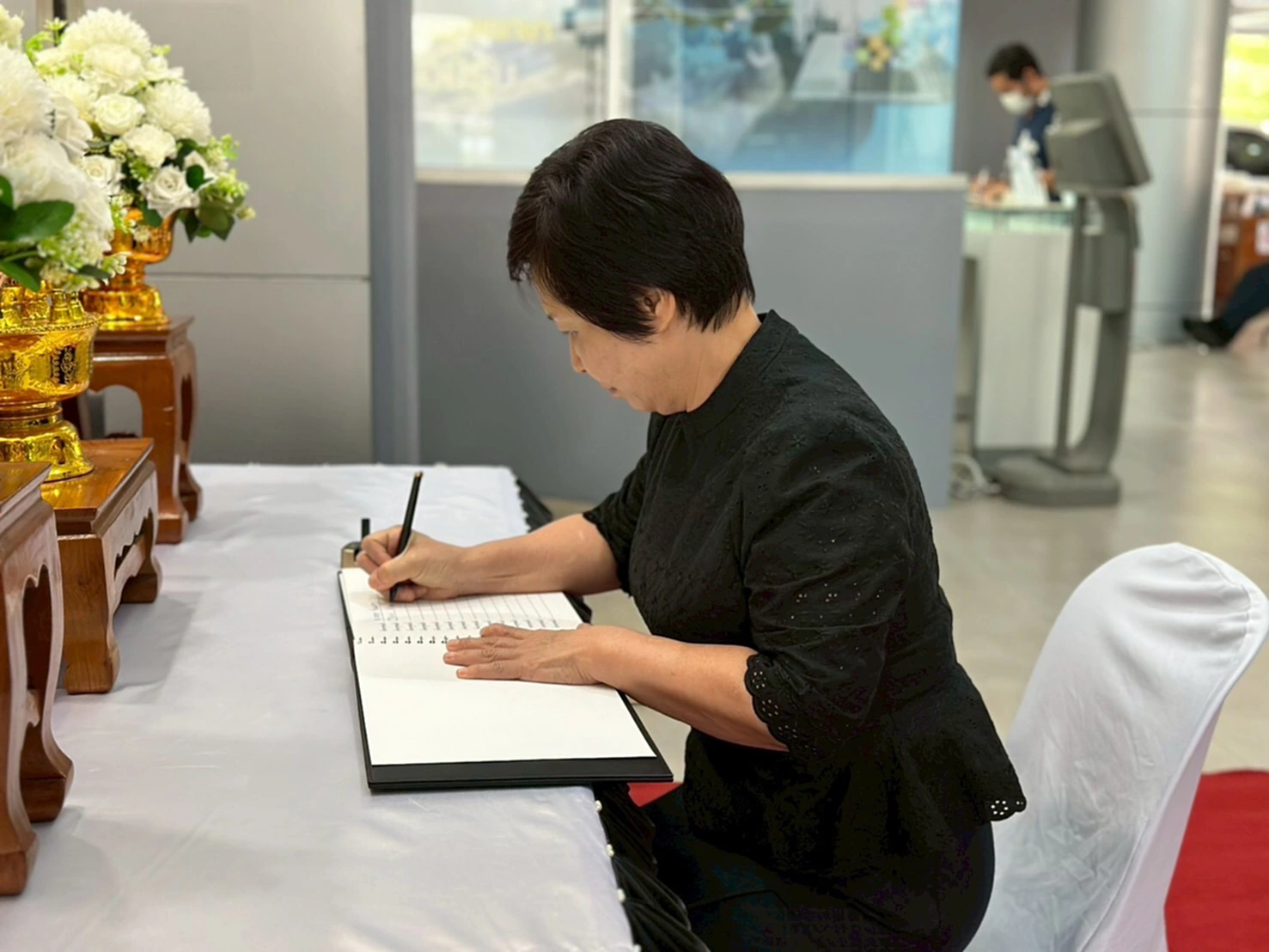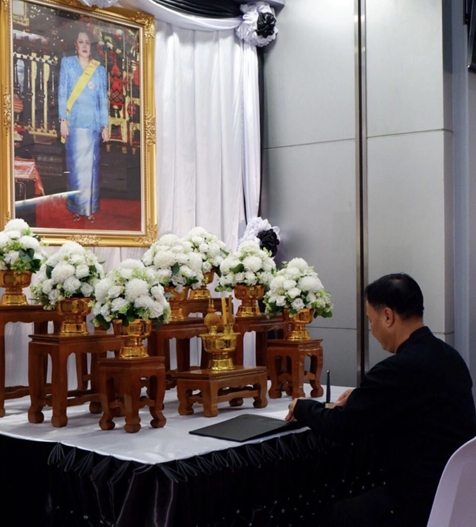 ร่วมยืนสงบนิ่งเป็นเวลา 93 วินาที พร้อมกันนี้ยังได้ร่วมลงนามถวายความอาลัย เบื้องหน้าพระฉายาลักษณ์สมเด็จพระนางเจ้าสิริกิติ์ พระบรมราชินีนาถ พระราชชนนีพันปีหลวง