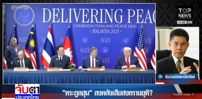 27 ต.ค.2568 รศ.ดร.ปณิธาน วัฒนายากร ผู้เชี่ยวชาญด้านความมั่นคงและการต่างประเทศ ให้สัมภาษณ์ในรายการจับตาประเทศไทย ทางท็อปนิวส์ ถึงผลการประชุมที่มีการลงนามสันติภาพไทย-กัมพูชา โดยมีโดนัลด์ ทรัมป์ประธานาธิบดีสหรัฐ และนายอันวาร์อิบราฮิมนายกรัฐมนตรี ในฐานะประธานอาเซียน ร่วมเป็นสักขีพยานว่า เราก็ไม่เห็นด้วยทั้งหมด แต่เราไม่ได้ยอมรับชื่อที่ติดอยู่บนผนังด้านหลังว่าเป็นข้อตกลงสันติภาพ เราถือว่าเป็นปฏิญาณร่วมกัน เพื่อที่จะเดินไปสู่ความสัมพันธ์ใหม่ ดังนั้นเราอาจจะไม่ได้ประโยชน์มากนักในการรักษาจุดยืนเดิมของเราไว้ แต่ที่ได้ประโยชน์แน่นอน คือการที่กัมพูชาได้เริ่มขยับออกกำลังบางส่วนออกไป แม้ว่านักวิเคราะห์จะบอกว่ามันน้อยมาก แต่ก็เป็นสัญลักษณ์ที่ยืนยันว่าเขาอาจจะเริ่มดำเนินการตามนี้