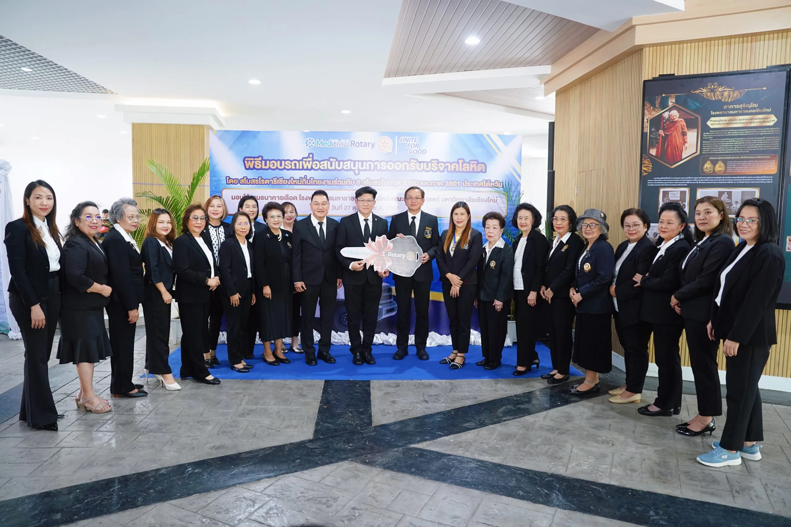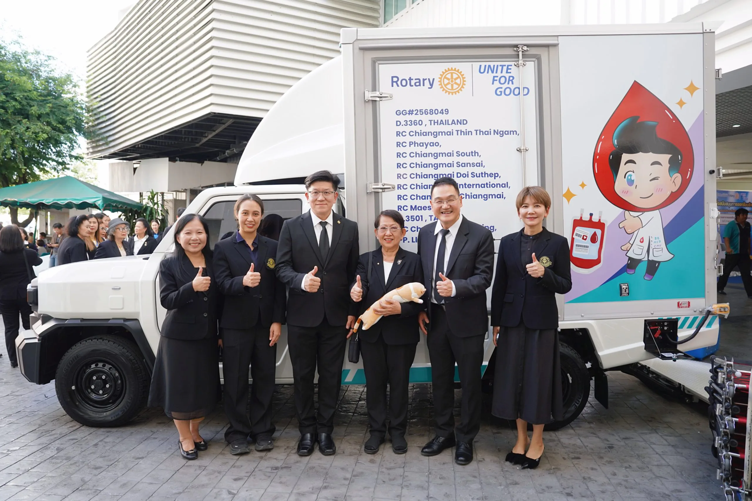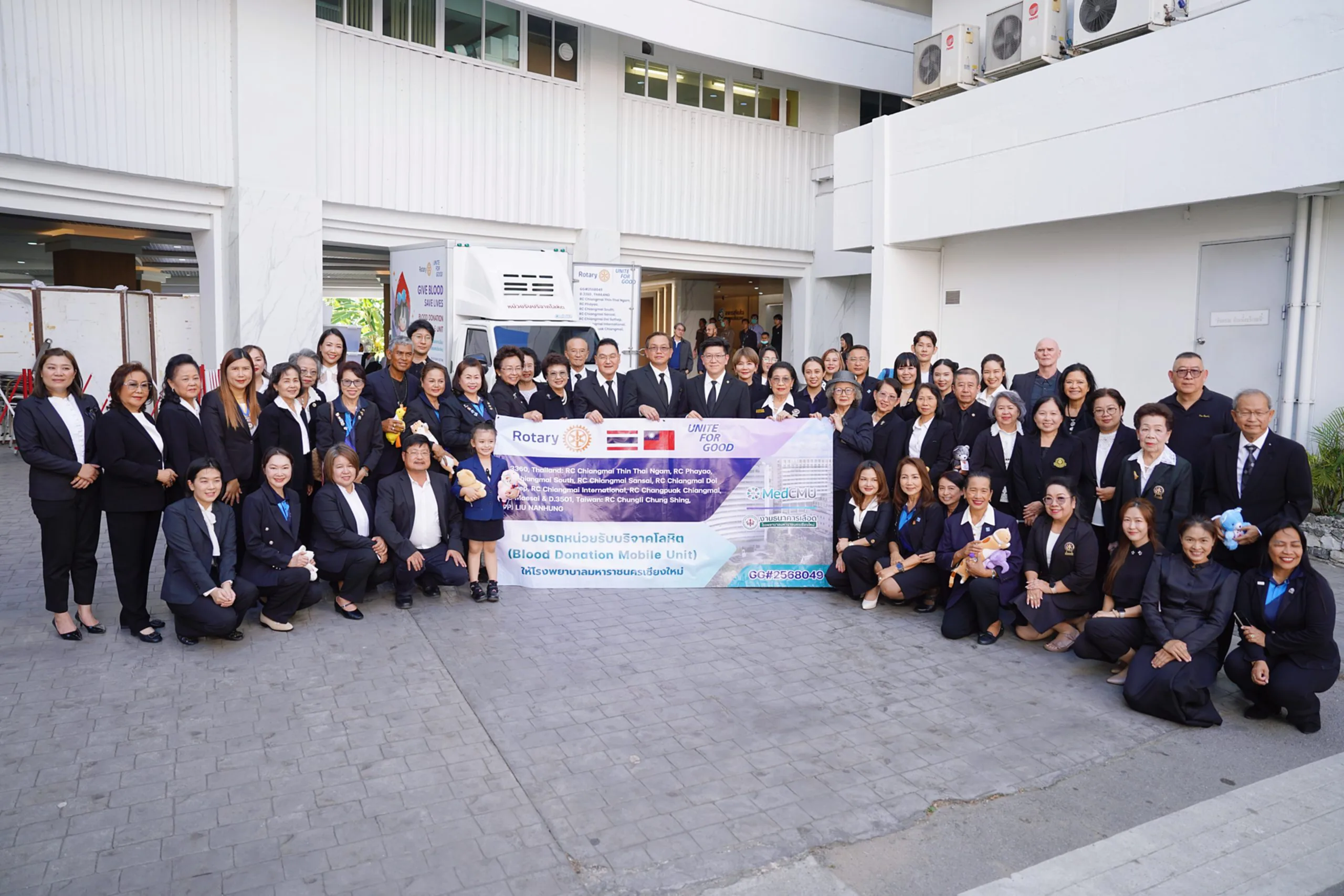 รศ.นพ.นเรนทร์ โชติรสนิรมิต คณบดีคณะแพทยศาสตร์ มช. พร้อมด้วย ศ.(เชี่ยวชาญพิเศษ)นพ.บรรณกิจ โลจนาภิวัฒน์ ที่ปรึกษาผู้ทรงคุณวุฒิ คณะแพทยศาสตร์ มช., ผศ.พญ.พุดตาน วงศ์ตรีรัตนชัย รองคณบดีด้านสื่อสารองค์กร คณะแพทยศาสตร์ มช., ผศ.พญ.ปัญจพร วงศ์มณีรุ่ง รองผู้อำนวยการโรงพยาบาลมหาราชนครเชียงใหม่, คุณมะลิวรรณ หินทอง เลขานุการคณะแพทยศาสตร์ มช. และคุณไพรจิตร ตานัน หัวหน้างานธนาคารเลือด รับมอบรถขนส่งโลหิตและอุปกรณ์ออกหน่วยรับบริจาคโลหิต จากสโมสรโรตารี เชียงใหม่ถิ่นไทยงาม สโมสรในภาค 3360 และภาค 3501 ประเทศไต้หวัน ณ โถงชั้น 1 อาคารสุจิณฺโณ คณะแพทยศาสตร์ มช.