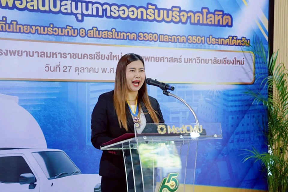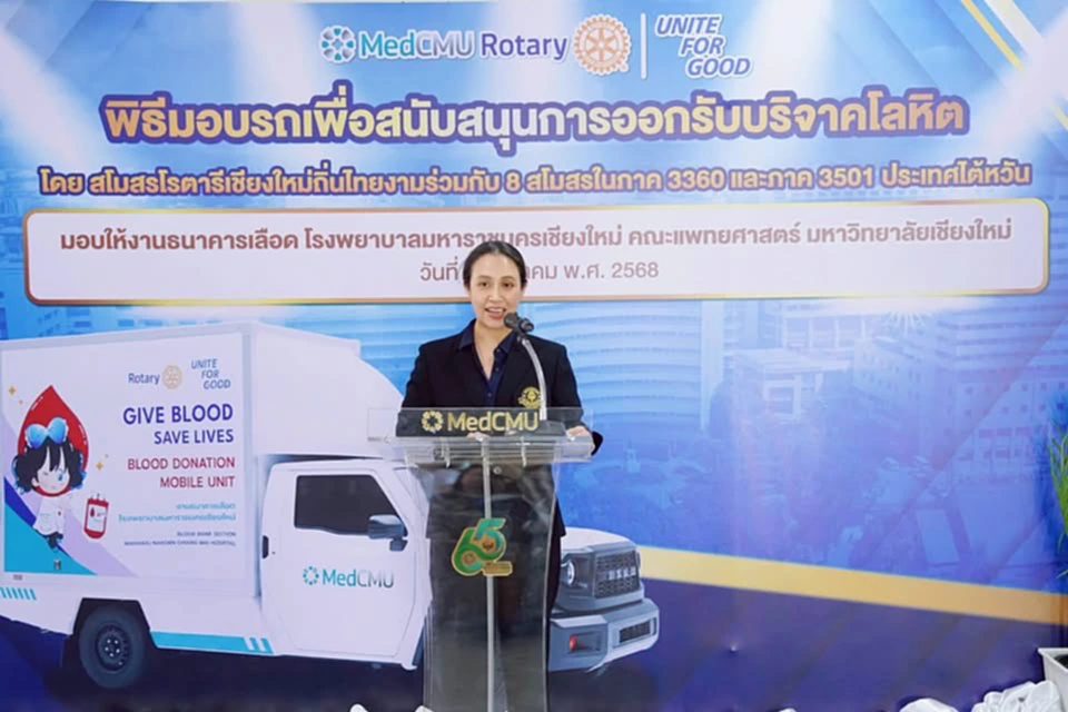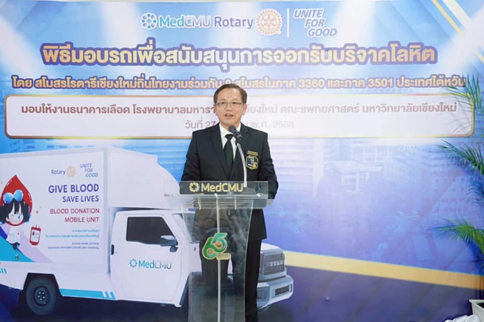 คณะแพทยศาสตร์ มช. รับมอบรถขนส่งโลหิตและอุปกรณ์ออกหน่วย รับบริจาคโลหิต นวัตกรรมทันสมัย ได้มาตรฐาน ตอบสนองทันเวลา ยกระดับภารกิจบริการโลหิตของโรงพยาบาลมหาราชนครเชียงใหม่ จากสโมสรโรตารี มูลค่า 2,163,200 บาท เพื่อใช้ในการออกหน่วยรับบริจาคโลหิตของงานธนาคารลือด โรงพยาบาลมหาราชนครเชียงใหม่