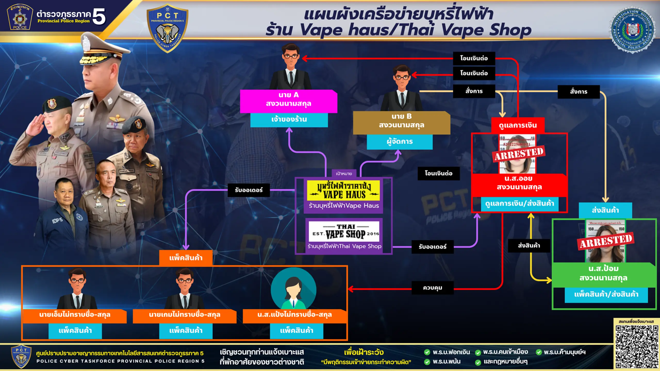 การจับกุมครั้งนี้สืบเนื่องมาจากการแพร่ระบาดของบุหรี่ไฟฟ้ามอมเมาเยาวชนในพื้นที่ภาคเหนือตอนบน มีการลอบค้าในโลกออนไลน์ ศูนย์ปราบปรามอาชญากรรมเทคโนโลยีสารสนเทศ ตำรวจภูธรภาค 5 (ศปอส.ภ.5) ร่วมกับ บก.สส.ภ.5 ทำการสืบสวนจนทราบว่ามีกลุ่มบุคคลที่ลักลอบจำหน่ายบุหรี่ไฟฟ้าผ่านระบบอินเตอร์เน็ตเว็บไซต์ ชื่อ “vapehaus URL: https://vapehaus.net” โดยมีรูปแบบสั่งซื้อสินค้าผ่านทางออนไลน์ แล้วจัดส่งทางขนส่งให้ถึงบ้าน จึงได้ทำการสืบสวนจนทราบว่ากลุ่มลักลอบจำหน่ายบุหรี่ไฟฟ้าดังกล่าว มีที่ตั้งของการกระทำความผิด จำนวน 3 จุด ประกอบด้วย ในพื้นที่ อ.เมืองเชียงใหม่ 1 จุด / พื้นที่ อ.หางดง จว.เชียงใหม่ จำนวน 2 จุด จึงได้รวบรวมข้อมูลการสืบสวนแล้วขออนุมัติศาลเพื่อทำการตรวจค้น