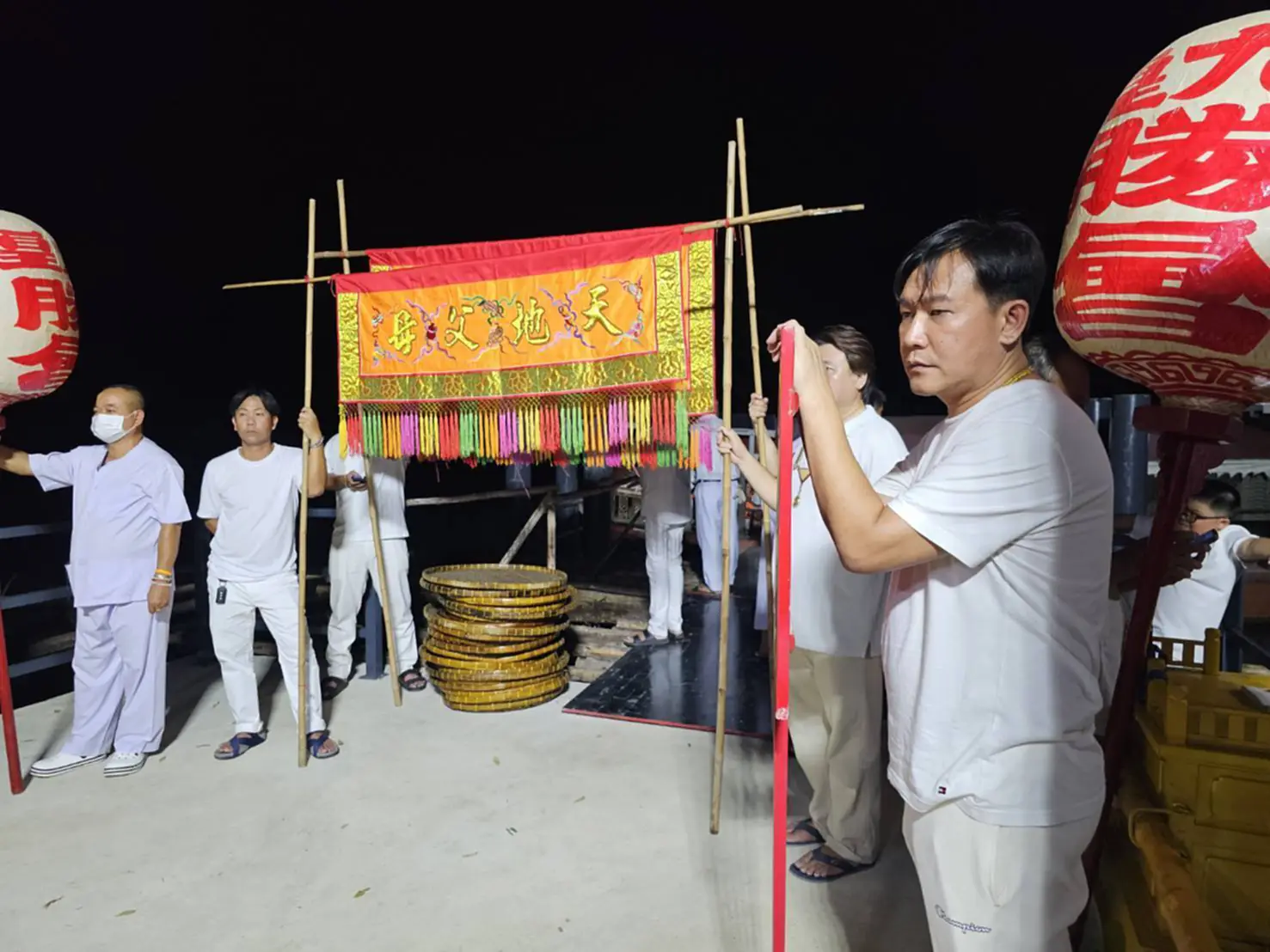 อัญเชิญธงธิวเสมือนเป็นการบอกกล่าว และอุทิศบุญกุศลให้ทั้ง 3 โลก คือ โลกสวรรค์ โลกมนุษย์ และโลกบาดาล ได้รับรู้ พอได้เวลาประมาณ 20.00 น. จึงเคลื่อนขบวนจากวัดจีนประชาสโมสร มายังท่าเทียบเรือตลาดบ้านใหม่ เดิมท่าเทียบเรือแห่งนี้ชำรุดทรุดโทรมพุพังไปตามกาลเวลา