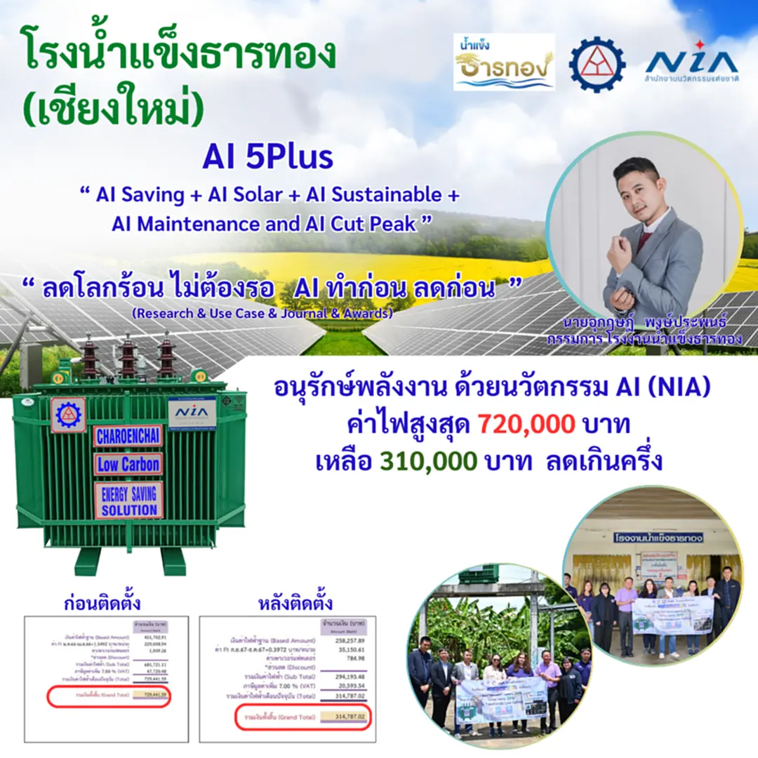 นายอุกฤษฎ์ พงษ์ประพนธ์ กรรมการโรงงานน้ำแข็งธารทอง กล่าวว่า เนื่องจากค่าไฟที่แพงขึ้น ส่งผลกระทบต่อต้นทุนการผลิตของโรงงานทำให้ภาคธุรกิจและภาคอุตสาหกรรมต้องเผชิญกับภาระค่าใช้จ่ายที่หนักหน่วงขึ้น ทำให้ตนได้มารู้จักนวัตกรรมหม้อแปลง Low Carbon ของบริษัท เจริญชัย หม้อแปลงไฟฟ้า จำกัด โดยโรงงานน้ำแข็งธารทองของเรา นำ AI Technology Energy Solution Platform ระบบบริหารจัดการพลังงานด้วยหม้อแปลง Low Carbon ร่วมกับพลังงานสะอาดแบบ IoT สู่ Net Zero มาติดตั้งใช้งานจริงในอุตสาหกรรม ทำให้โรงน้ำแข็งเพิ่มผลผลิตน้ำแข็งในตอนกลางวันมากขึ้น