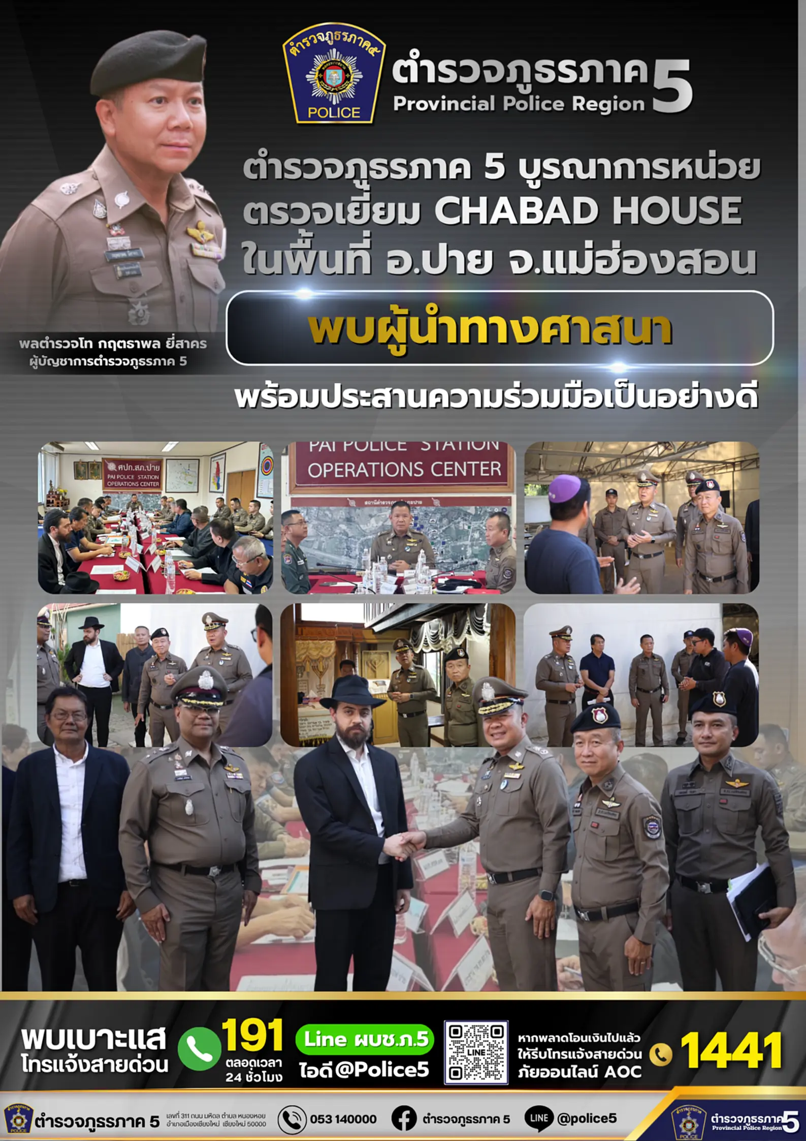 ต่อมาในวันดียวกันเวลา 15.30 น. พล.ต.ต.วรพงศ์ คำลือ รอง ผบช.ภ.5 ได้ร่วมบูรณาการหน่วยที่เกี่ยวข้องตรวจเยี่ยม Chabad House ซึ่งเป็นสถานที่ประกอบพิธีกรรมทางศาสนาและศูนย์รวมของชาวอิสราเอล ในพื้นที่ อ.ปาย จ.แม่ฮ่องสอน โดยได้ร่วมพบปะพูดคุยกับผู้นำทางศาสนาซึ่งได้รับความร่วมมือเป็นอย่างดี