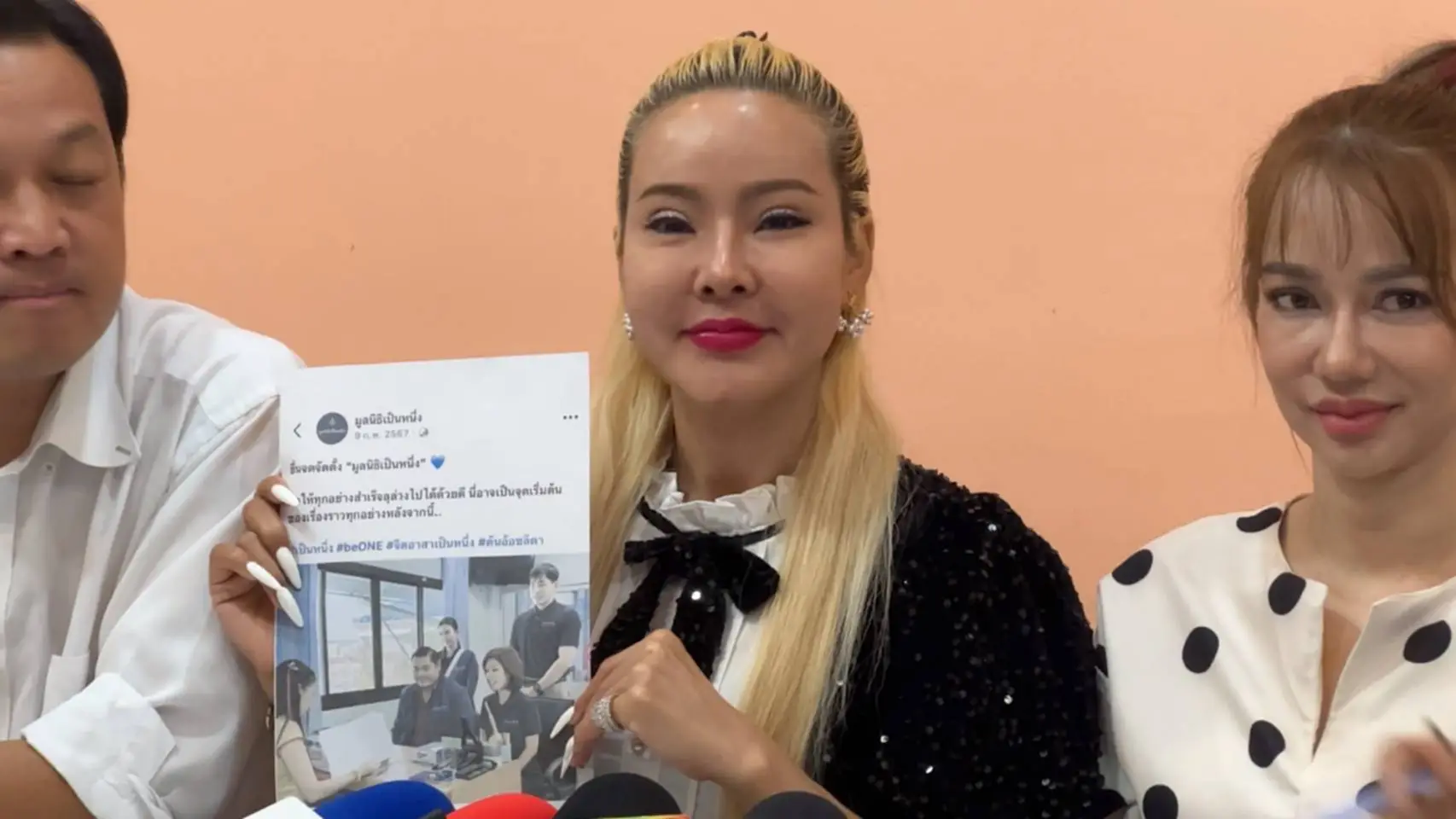 เมื่อวันที่ 30 ตุลาคม 2568 ที่สำนักงานนายแม่ปุ๊กกี้ อ.ปากเกร็ด จ.นนทบุรี น.ส.วิไลลักษณ์ ไชยชาญ หรือซ้อลักษณ์ ,นายภูวกร ศรีเนียน ,นางชฎาภรณ์ พงศ์ทองเมือง หรือนายแม่ปุ๊กกี้ พร้อมด้วย น.ส.บุญยนุช แสงศรี เจ้าของเพจออยศรีและผองเผือก ได้นำเอกสารหลักฐานต่างๆแถลงข่าวความคืบหน้าการตรวจสอบ “มูลนิธิเป็นหนึ่ง” กรณีการปลอมลายมือชื่อจัดตั้งมูลนิธิฯ ,การเปิดรับบริจาค และทุกคดีความที่เคยเป็นข่าว