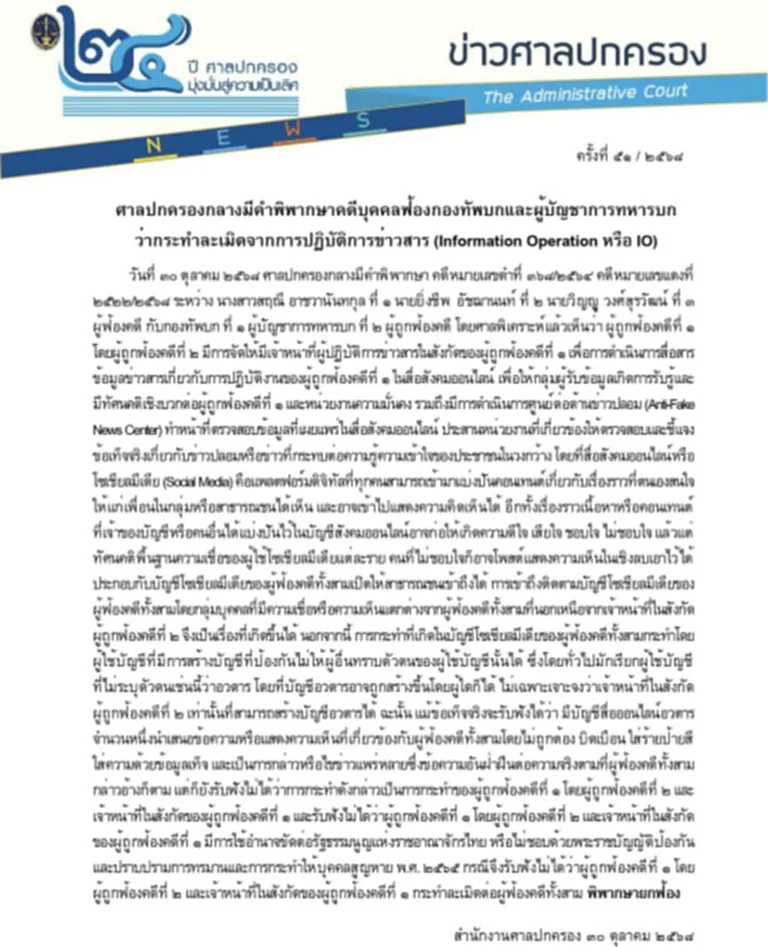 โดยคำพิพากษาของศาลปกครองกลาง พิเคราะห์แล้วเห็นว่า กองทัพบกโดยบัญชาการทหารบก มีการจัดให้มีเจ้าหน้าที่ผู้ปฏิบัติการข่าวสารในสังกัด เพื่อการดำเนินการสื่อสารข้อมูลข่าวสารเกี่ยวกับการปฏิบัติงานของกองทัพบกในสื่อสังคมออนไลน์ เพื่อให้กลุ่มผู้รับข้อมูลเกิดการรับรู้และ มีทัศนคติเชิงบวกต่อกองทัพบก และหน่วยงานความมั่นคง รวมถึงมีการดำเนินการศูนย์ต่อต้านข่าวปลอม หรือ Anti-Fake News Center ทำหน้าที่ตรวจสอบข้อมูลที่เผยแพร่ในสื่อสังคมออนไลน์ ประสานหน่วยงานที่เกี่ยวข้องให้ตรวจสอบ และชี้แจงข้อเท็จจริงเกี่ยวกับข่าวปลอมหรือข่าวที่กระทบต่อความรู้ความเข้าใจของประชาชนในวงกว้าง