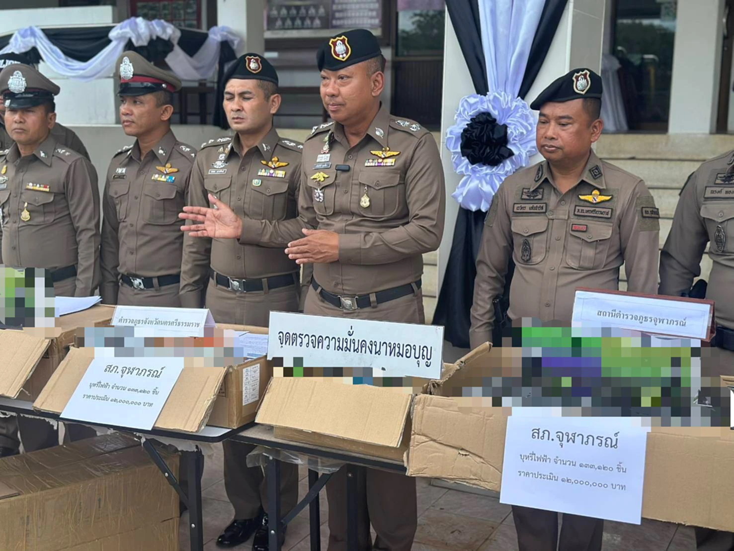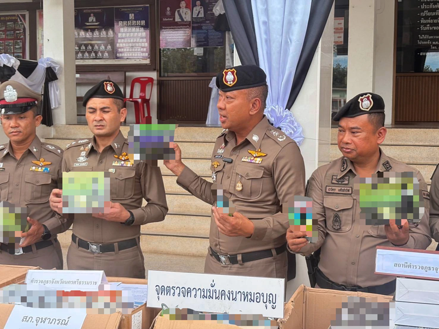 วันที่ 31 ต.ค. 2568 ที่สถานีตำรวจภูธรจุฬาภรณ์ จ.นครศรีธรรมราช พล.ต.ต.เกรียงศักดิ์ นุ่นเกลี้ยง ผบก.ภ.จว.นครศรีธรรมราช พร้อมด้วย พ.ต.อ.ธนพล เยาวพักตร์ ผกก.ภ.จุฬาภรณ์ และชุดสืบสวน ร่วมกันแถลงข่าวผลการจับกุมคดีสำคัญ หลังสามารถตรวจยึดบุหรี่ไฟฟ้าและน้ำยาบุหรี่ไฟฟ้าจำนวนมาก รวมกว่า 133,120 ชิ้น มูลค่าประเมินกว่า 12,000,000 บาท ได้จากรถบรรทุกต้องสงสัย เหตุการณ์ดังกล่าวเกิดขึ้นบริเวณ หน้าที่พักสายตรวจบ้านควนมุด ถนนสายบ่อล้อ–ลำทับ ต.ควนมุด อ.จุฬาภรณ์ จ.นครศรีธรรมราช ขณะเจ้าหน้าที่สายตรวจออกปฏิบัติหน้าที่ตรวจสอบพื้นที่ พบรถบรรทุกไม่ประจำทาง ยี่ห้อ ฮีโน่ สีเทา จอดอยู่ในลักษณะต้องสงสัย จึงได้เรียกตรวจค้น พบว่าภายในตัวรถมีการลักลอบซุกซ่อนกล่องกระดาษจำนวนมาก ภายในบรรจุบุหรี่ไฟฟ้าและน้ำยาบุหรี่ไฟฟ้าหลากหลายยี่ห้อ ไม่มีเอกสารการนำเข้าหรือใบอนุญาตจากหน่วยงานที่เกี่ยวข้อง