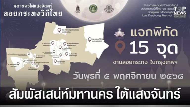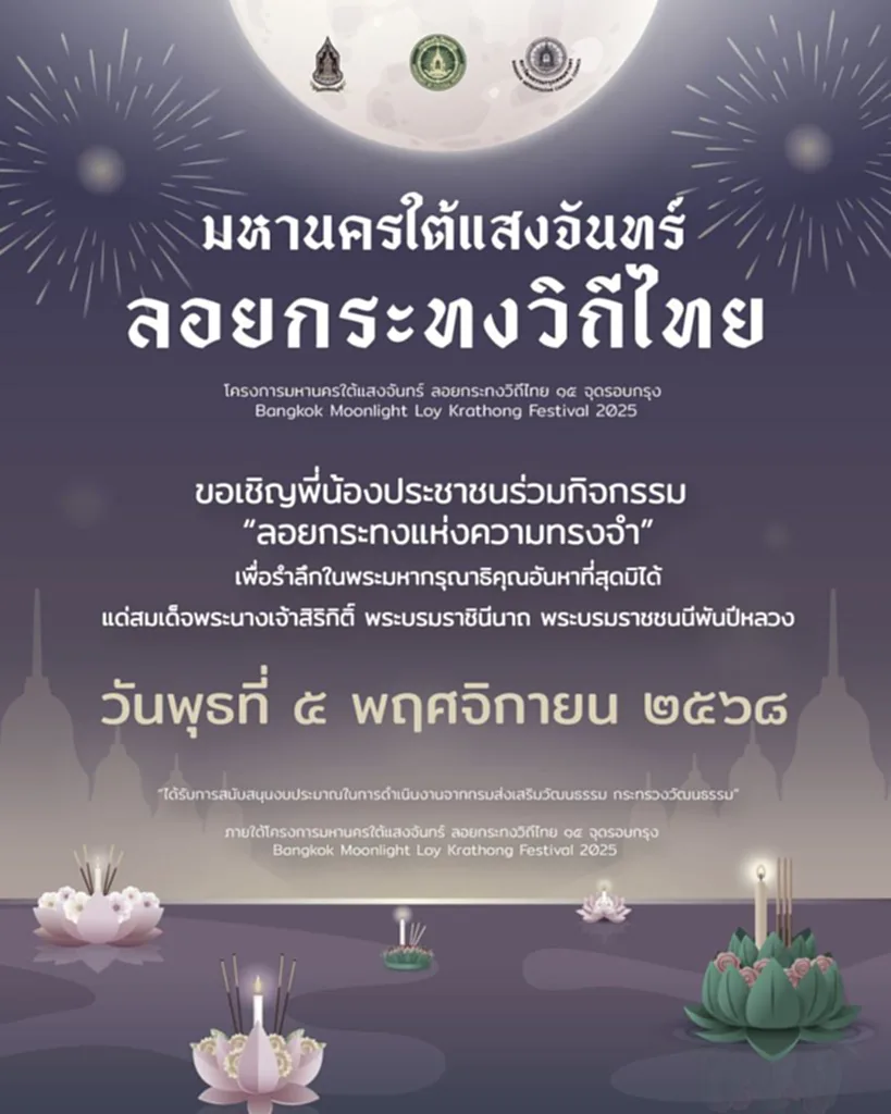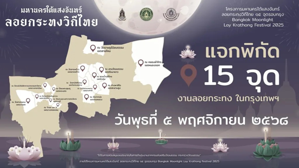 โดย กรมส่งเสริมวัฒนธรรม กระทรวงวัฒนธรรม ร่วมกับ สภาวัฒนธรรมกรุงเทพมหานคร และเขตพื้นที่จัดงาน เตรียมจัดงานใหญ่ประจำปีเพื่อสืบสานประเพณีลอยกระทงอย่างยิ่งใหญ่ ภายใต้ชื่องาน “มหานคร ใต้แสงจันทร์ ลอยกระทงวิถีไทย 15 จุด รอบกรุง” โดยกำหนดจัดขึ้นในคืนวันเพ็ญเดือนสิบสอง ในวันที่ 5 พฤศจิกายน 2568 ณ พื้นที่จัดงานหลักและพื้นที่จัดงานย่อยรวม 15 จุด ทั่วกรุงเทพมหานคร เพื่ออำนวยความสะดวกและกระจายความสุขให้กับประชาชนในทุกพื้นที่