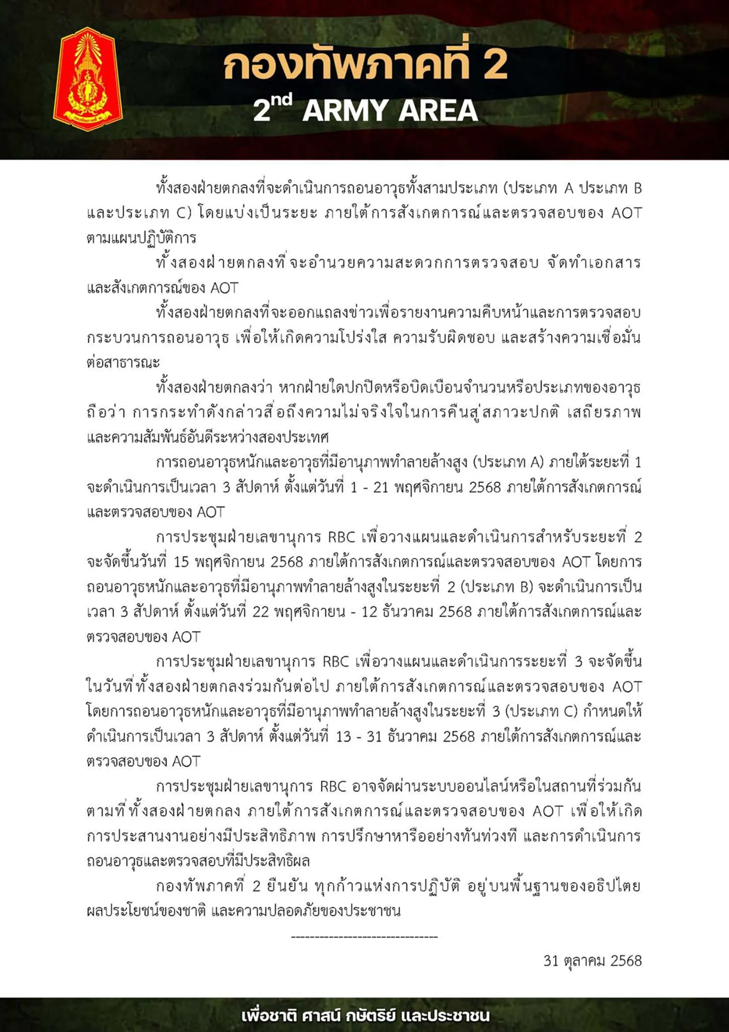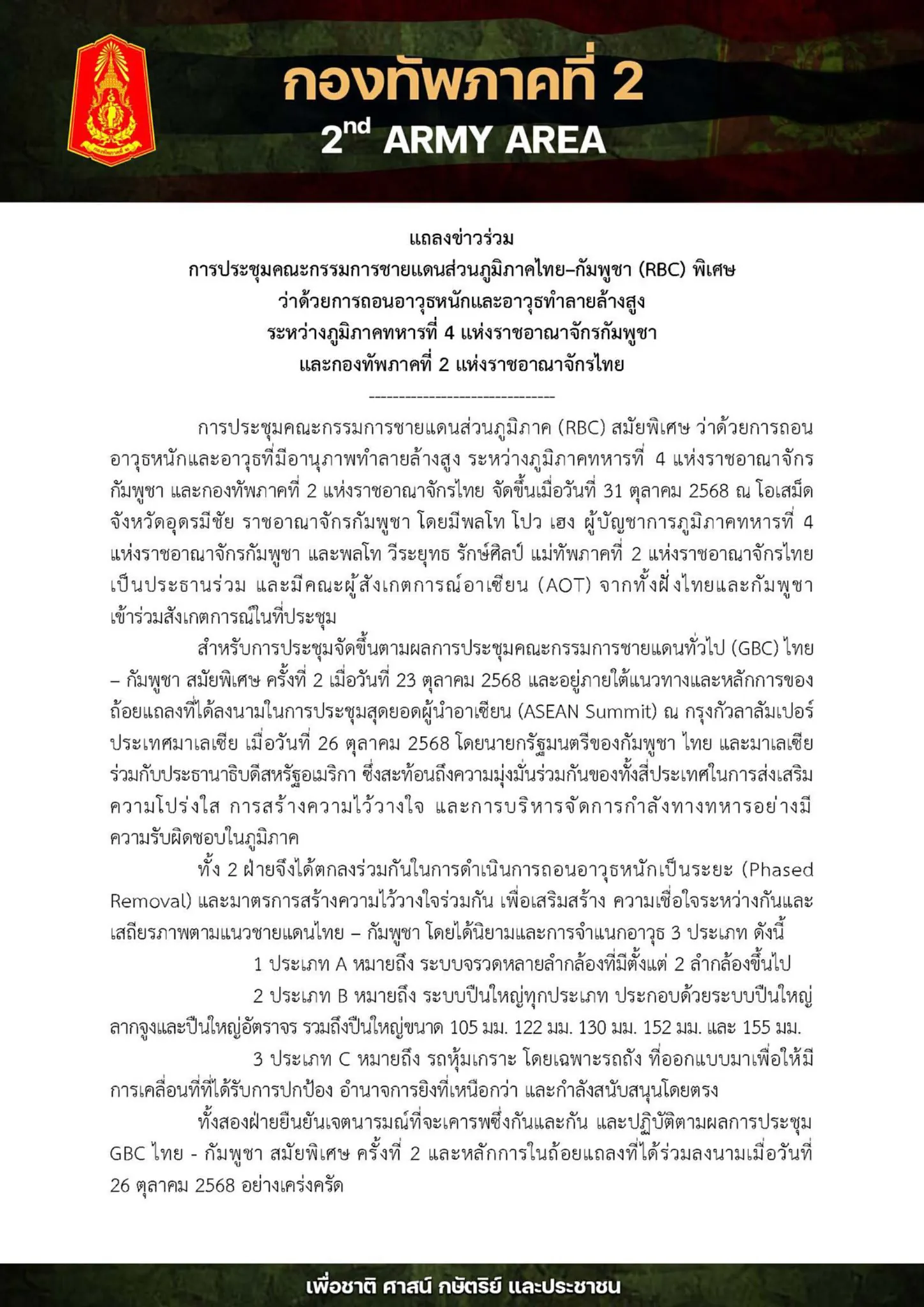 เมื่อวันที่ 31 ตุลาคม 2568 กองทัพภาคที่ 2 ได้ออกแถลงข่าวการประชุมคณะกรรมการชายแดนส่วนภูมิภาคไทย-กัมพูชา (RBC) พิเศษ ว่าด้วยการถอนอาวุธหนักและอาวุธทำลายล้างสูง ระหว่างภูมิภาคทหารที่ 4 แห่งราชอาณาจักรกัมพูชา และกองทัพภาคที่ 2 แห่งราชอาณาจักรไทย ที่ด่านช่องจอม อำเภอกาบเชิง จังหวัดสุรินทร์