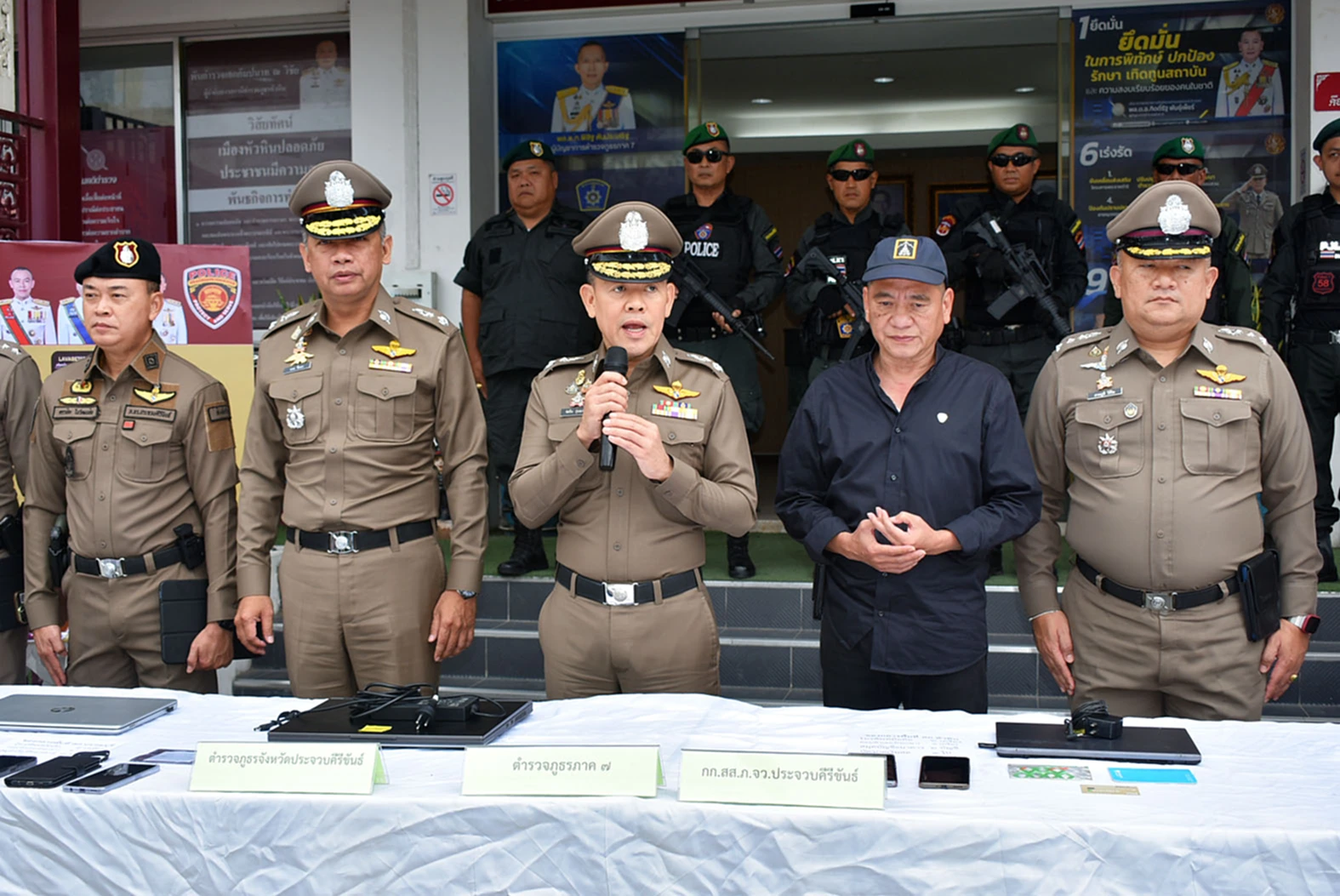 วันที่ 31 ต.ค. 2568 ผู้สื่อข่าวรายงานว่า ที่ สภ.หัวหิน จ.ประจวบฯ พล.ต.ต.ชมชวิณ ปุระธนานนท์ รอง ผบช.7 พร้อมด้วย พล.ต.ต.อาทร ชิ้นทอง ผบก.จ.ประจวบฯ พ.ต.อ.ภาคภูมิ โห้ใย รอง ผบก.จ.ประจวบฯ พ.ต.อ.หงส์พรหม วิศิษฏ์ชนะชัย ผกก.สภ.ปราณบุรี และ พ.ต.อ.กัมปนาท ณ วิชัย ผกก.สภ.หัวหิน พร้อมชุดสืบสวน ร่วมแถลงข่าวการจับกุมผู้ต้องหาเว็บพนัน “lavabet555” จำนวน 3 ราย พร้อมของกลาง คอมพิวเตอร์ตั้งโต๊ะ Note Book โทรศัพท์มือถือ บัตรกดเงินสด ATM และสมุดบัญชีธนาคารจำนวนหลายรายการ
