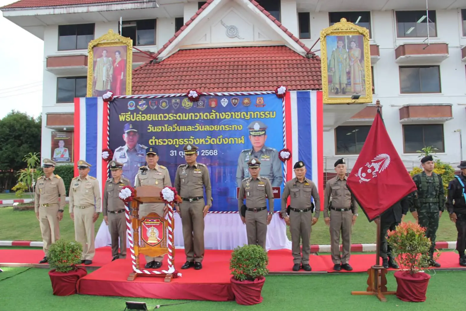 วันที่ 31 ตุลาคม 2568 เวลา 17.00 น. ที่กองบังคับการตำรวจภูธรจังหวัดบึงกาฬ นายนคร ศิริปริญญานันท์ รองผู้ว่าราชการจังหวัด รักษาราชการแทนผู้ว่าราชการจังหวัดบึงกาฬ เป็นประธานในพิธีปล่อยแถวระดมกวาดล้างอาชญากรรมช่วงวันฮาโลวีนและวันลอยกระทง พร้อมให้โอวาทแก่เจ้าหน้าที่ผู้ปฏิบัติหน้าที่