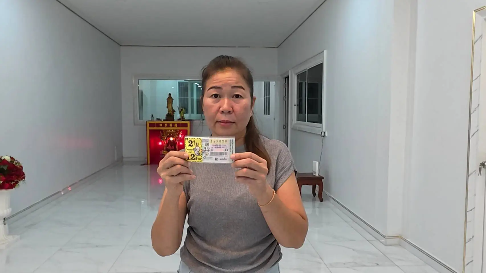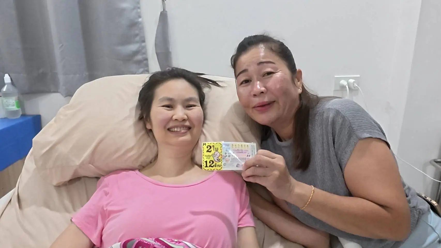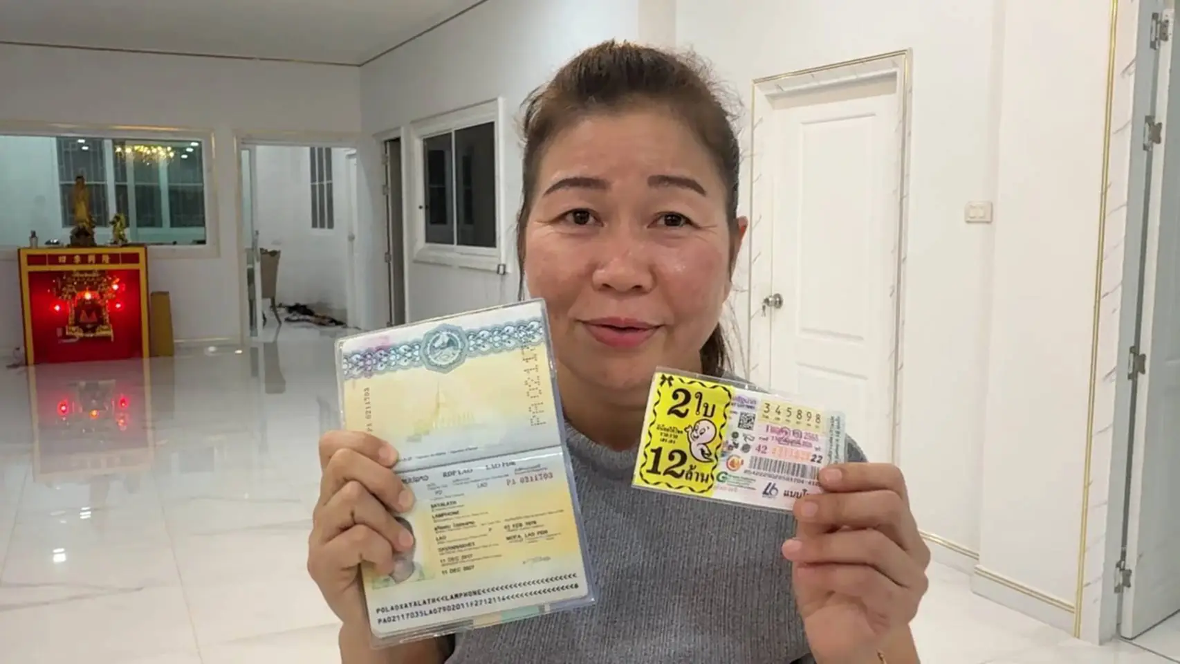 จนเมื่อช่วงเช้าวันนี้ ตนเองจะออกไปหาซื้อล็อตตารี่เลขท้าย 097 ได้พูดคุยกับนายจ้างสาว จึงรู้ว่านายจ้างได้ฝันเลข 790 จึงจะออกไปซื้อล็อตตารี่เลขนี้ให้นายจ้างด้วย แต่เมื่อไปถึงแผงหวยในตลาดคลอง 16 ต.ดอนฉิมพลี อ.บางน้ำเปรี้ยว จ.ฉะเชิงเทรา เลขดังกล่าวไม่มีแล้ว หรือแต่หมายเลข 345898 จำนวน 2 ใบ ตนเองจึงซื้อกลับบ้านมา เมื่อมาถึงบ้านก็เก็บล็อตตารี่ไว้ในห้องนอน และออกมาล้างศาลพระภูมิหน้าบ้าน ตามคำสั่งของนายจ้าง เมื่อล้างเสร็จจึงได้จุดธูป ขอศาลพระภูมิว่า ตนเองเดือดร้อนเป็นหนี้ จะไม่มีบ้านอยู่กำลังจะโดนยึด ขอให้เจ้าหน้าที่ศาลพระภูมิช่วย ให้เลขหน้าและเลขท้ายรางวัลที่ 1 ตรงกับล็อตตารี่ที่ตนเองซื้อมา พอช่วงบ่ายหวยกำลังออก ตอนนั้นตนเองได้ป้อนข้าวนายจ้างอยู่ และจำเลขที่ซื้อได้ จึงหยิบโทรศัพท์ขึ้นมาดู ก็พบว่าตนเองถูกหวยรางวัลที่ 1 จึงกระโดดดีใจร้องกรี๊ดกับนายจ้างสาว หลังจากนี้ขึ้นเงินแล้ว จะมอบให้นายจ้างสาวตามที่ได้บอกไว้จำนวน 2 ล้านบาท และจะขอนายจ้างกลับบ้านเกิดที่ประเทศลาว นำเงินไปใช้หนี้ให้หมด กันเงินไว้ทำบุญและเก็บไว้ใช้ยามแก่เฒ่า ซึ่งหลังจากนี้ตนเองก็ยังคงดูแลนายจ้างสาวที่ป่วยติดเตียงต่อไป