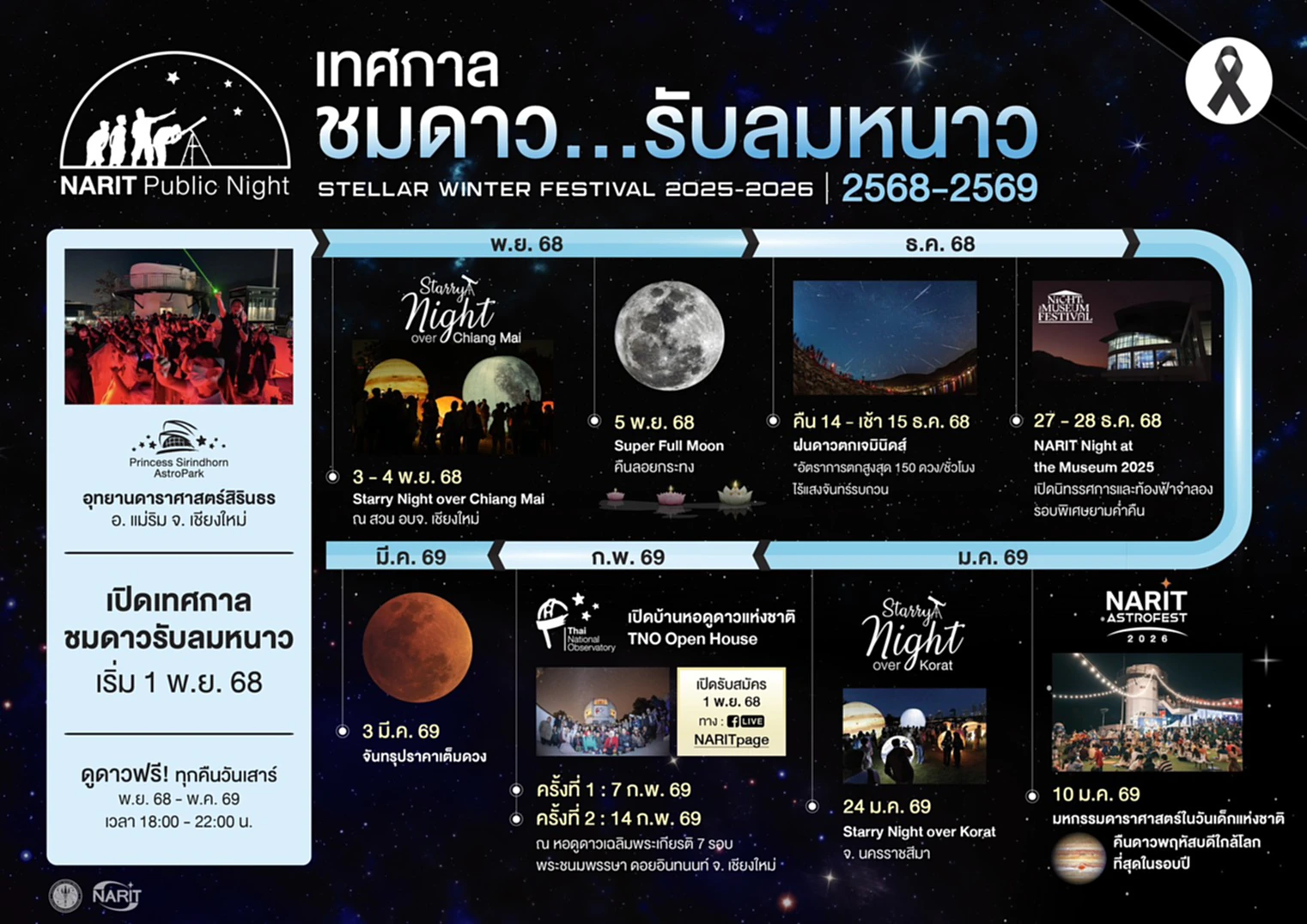 วันที่ 1 พฤศจิกายน 2568 นายทศพล เผื่อนอุดม ผู้ว่าราชการจังหวัดเชียงใหม่ ให้เกียรติเป็นประธานเปิดเทศกาลชมดาว…รับลมหนาว 2568-2569 โดยมี ดร. วิภู รุโจปการ ผู้อำนวยการสถาบันวิจัยดาราศาสตร์แห่งชาติ พร้อมด้วยหัวหน้าหน่วยงานราชการ สถานศึกษา ผู้บริหาร และเจ้าหน้าที่สถาบันวิจัยดาราศาสตร์แห่งชาติ ประชาชนและเยาวชน เข้าร่วมกิจกรรมจำนวนมาก ณ อาคารท้องฟ้าจำลองและนิทรรศการ อุทยานดาราศาสตร์สิรินธร อ. แม่ริม จ. เชียงใหม่ โดยการจัดงานในวันนี้ ได้ปรับรูปแบบกิจกรรมให้เหมาะสม พร้อมจัดให้มีพิธีจุดเทียนแสดงความอาลัยถวายแด่สมเด็จพระนางเจ้าสิริกิติ์ พระบรมราชินีนาถ พระบรมราชชนนีพันปีหลวง และสงบนิ่งเป็นเวลา 93 วินาที เพื่อน้อมรำลึกในพระมหากรุณาธิคุณอันหาที่สุดมิได้