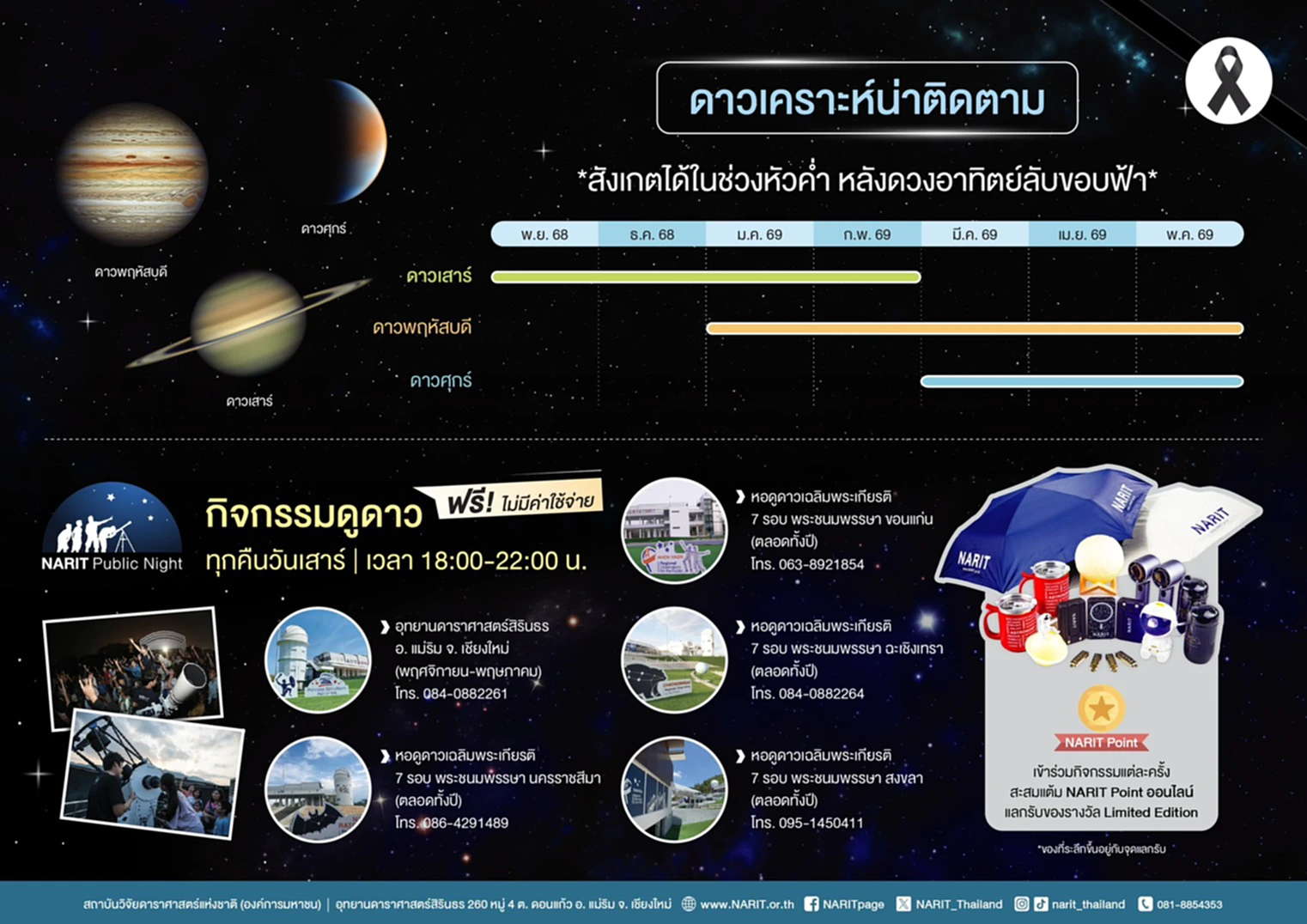 ดร. วิภู รุโจปการ ผู้อำนวยการสถาบันวิจัยดาราศาสตร์ กล่าวว่า กิจกรรม “เปิดเทศกาลชมดาว…รับลมหนาว ประจำปี 2568-2569” ที่เริ่มต้นขึ้นในวันนี้ ถือเป็นการประกาศการเริ่มต้นฤดูกาลดูดาวในช่วงฤดูหนาวของจังหวัดเชียงใหม่ หลังจากนี้เป็นต้นไป ตั้งแต่เดือนพฤศจิกายน 2568 – พฤษภาคม 2569 จะเปิดให้ชาวเชียงใหม่และนักท่องเที่ยวที่สนใจมาร่วมดูดาวเป็นประจำทุกคืนวันเสาร์ กับกิจกรรม NARIT Public Night เวลา 18:00 – 22:00 น. ณ อุทยานดาราศาสตร์สิรินธร โดยไม่มีค่าใช้จ่าย