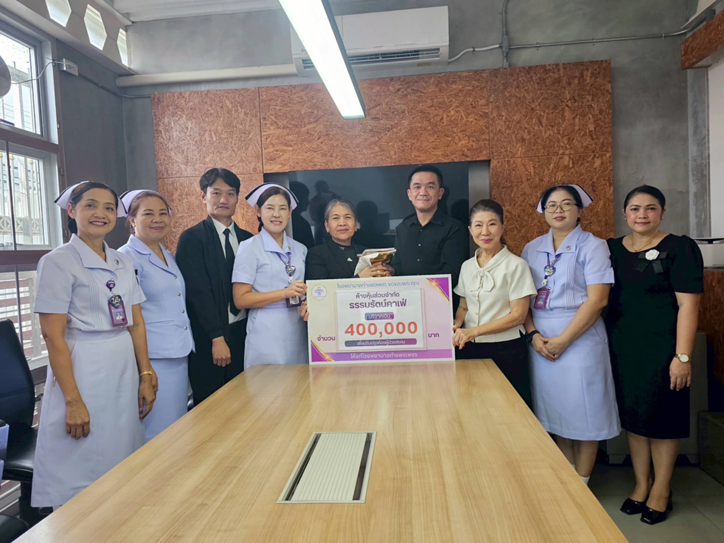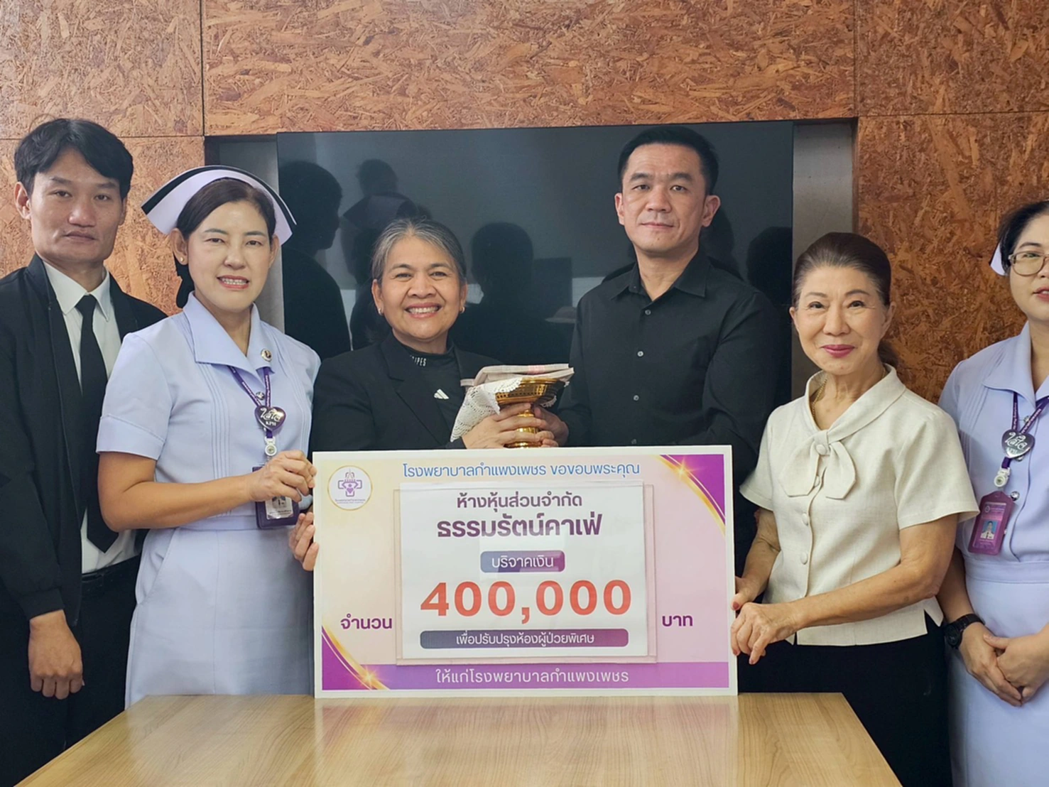 เมื่อวันที่ 1 พฤศจิกายน 2568 นางรัชนี อัศวสุธีรกุล พร้อมด้วย นายธเนศ อัศวสุธีรกุล ห้างหุ้นส่วนจำกัด ธรรมรัตน์คาเฟ่ ร่วมมอบเงินสดจำนวน 400,000 บาท เพื่อปรับปรุงห้องผู้ป่วยพิเศษให้แก่โรงพยาบาลกำแพงเพชร โดยมี แพทย์หญิงอังคณา อุปพงษ์ ผู้อำนวยการโรงพยาบาลกำแพงเพชร พร้อมด้วย พว.ฐิติมาน แก้วขาว หัวหน้ากลุ่มภารกิจด้านการพยาบาล นายสุรศักดิ์ ใบเนียม หัวหน้ากลุ่มภารกิจด้านอำนวยการ และคณะเจ้าหน้าที่โรงพยาบาลกำแพงเพชรเป็นผู้รับมอบ