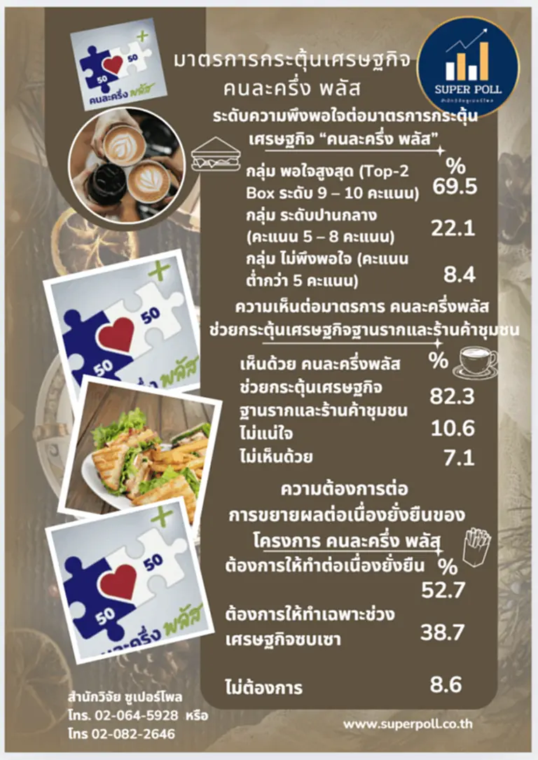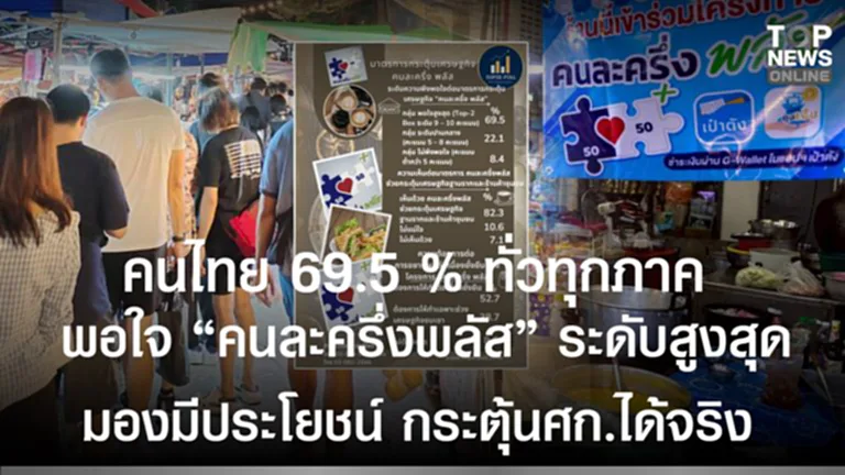 ซูเปอร์โพล ชี้ประชาชน 69.5 % ทั่วไทย พอใจ “คนละครึ่งพลัส” ระดับสูงสุด มองมีประโยชน์ คนได้จับจ่ายใช้สอยช่วยกระตุ้นเศรษฐกิจจริง