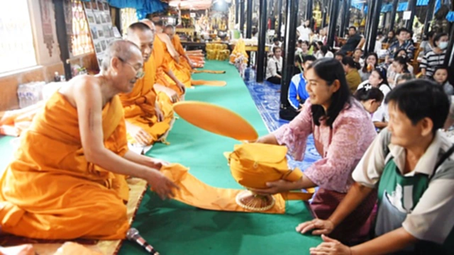 โดยในปีนี้ทางวัดได้ใช้พื้นที่รอบพระอุโบสถที่กำลังก่อสร้างเป็นสถานที่จัดเลี้ยงโรงทานให้กับประชาชน กว่า50 ร้านค้า ที่มีอาหารคาดหวานหลากหลายอาทิเช่น ขนมจีนน้ำยา หัวหมูต้มราดน้ำจิ๋มรสเด็ด กระเพาะปลา ก๋วยจั๋บ ก๋วยเตี๋ยว ขนมปัง ลูกชิ้นทอด และอื่นๆอีกหลายรายการ จากนั้นในเวลา 10.30 น. พระครูปลัดเพลินเตชธัมโม เจ้าอาวาสวัดลาดขาม ประธานฝ่ายสงฆ์ ได้นำคณะศิษยานุศิษย์นำผ้าไตรจีวร พุ่มผ้าป่า เดินวนรอบพระอุโบสถที่ประดิษฐานพระพุทธเจ้า28 พระองค์ จำนวน3รอบ ก่อนวนเข้าสู่ภายในศาลา เพื่อประกอบพิธีถวายผผ้าป่าสามัคคี ประจำปี 2568 เพื่อสมทบทุนซื้ออิฐบูรณะโบสถ์โบราณที่ยังไม่แล้วเสร็จและสมทบทุนก่อสร้างศาลาการเปรียญหลังใหม่แทนหลังเดิมที่มีความชำรุดทรุดโทรมตามกาลเวลา
